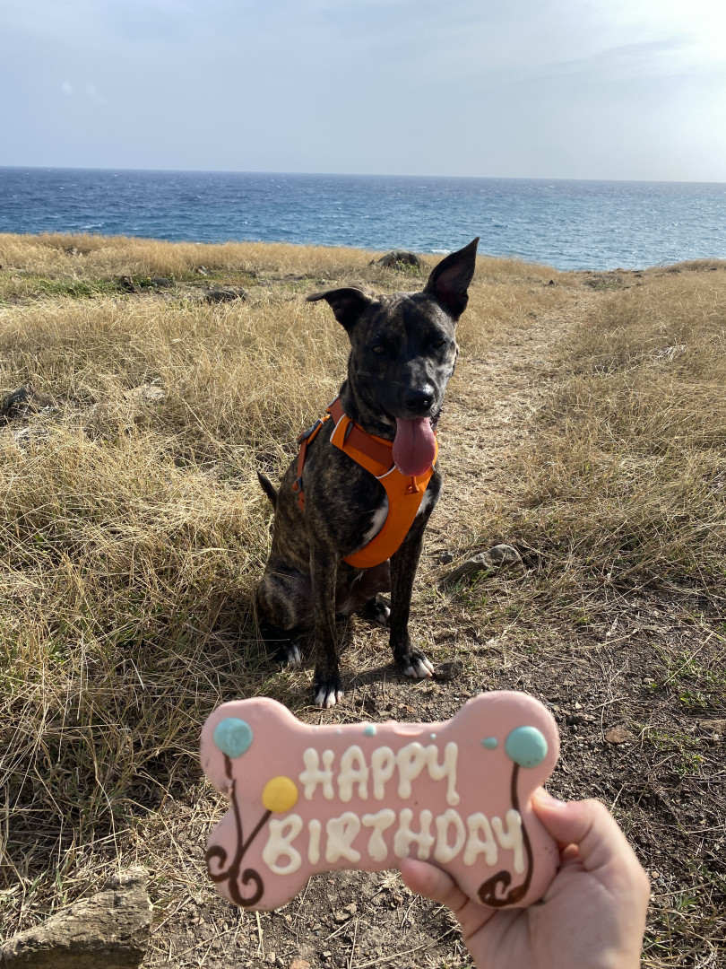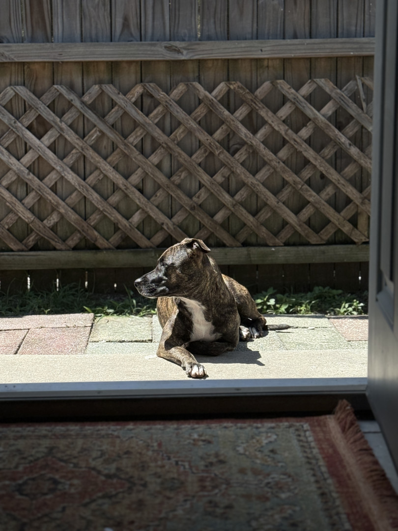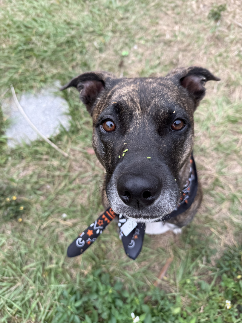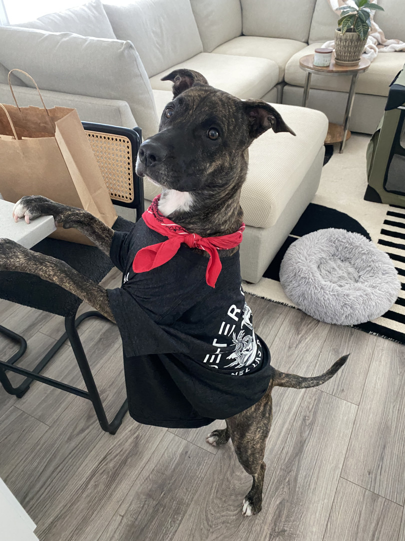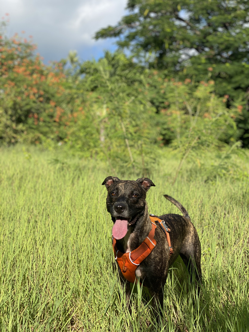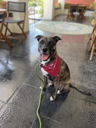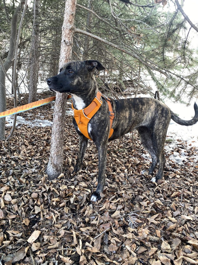 Oakley is a goody pit/ staffy mix who loves hiking, swimming, adventuring, and playing fetch. She is also a huge snuggle bug!