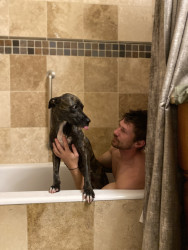 Oak is a goofy, loving, fun, beautiful brindle pit mix, and my goal is to show people that pits aren't all bad. She is timid, but adored by everyone who meets her. She comforts anyone who needs it, and is always good for a laugh -- needed or not!