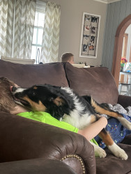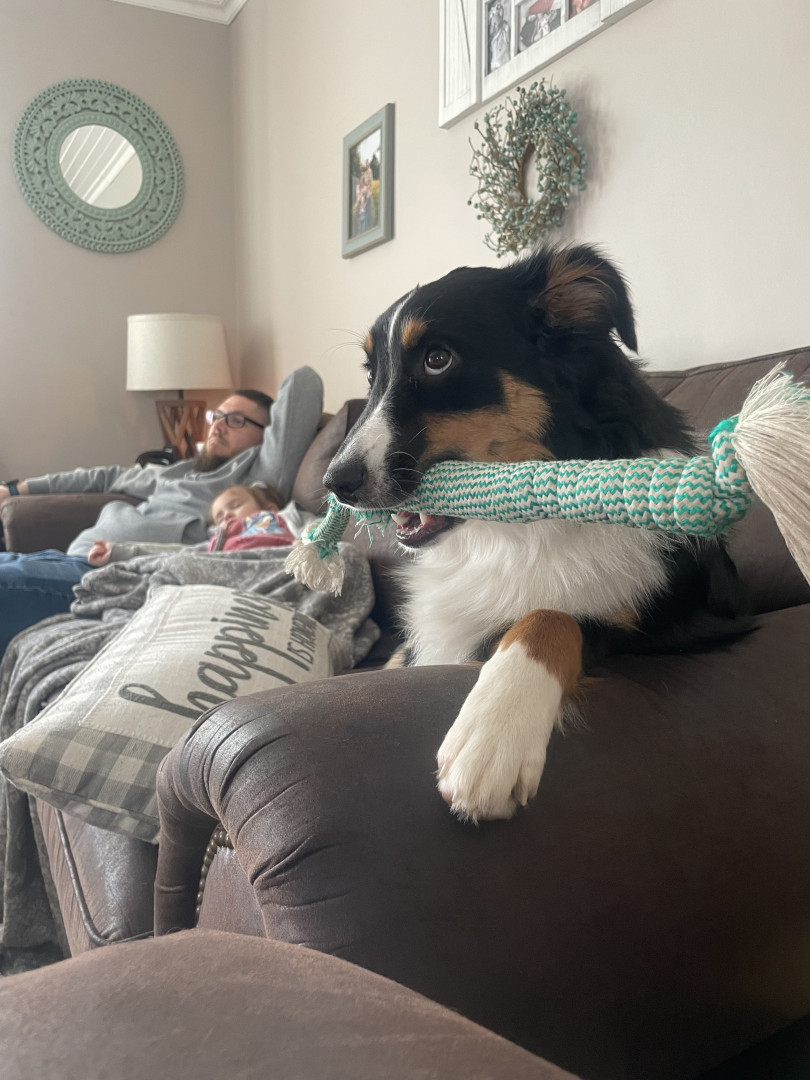 Oakley has helped me get through battling PTSD. She is a natural lover and protector. She is extremely loyal and has the patience of a saint. She loves to pretend acting like a rabid dog with her 3 kids.