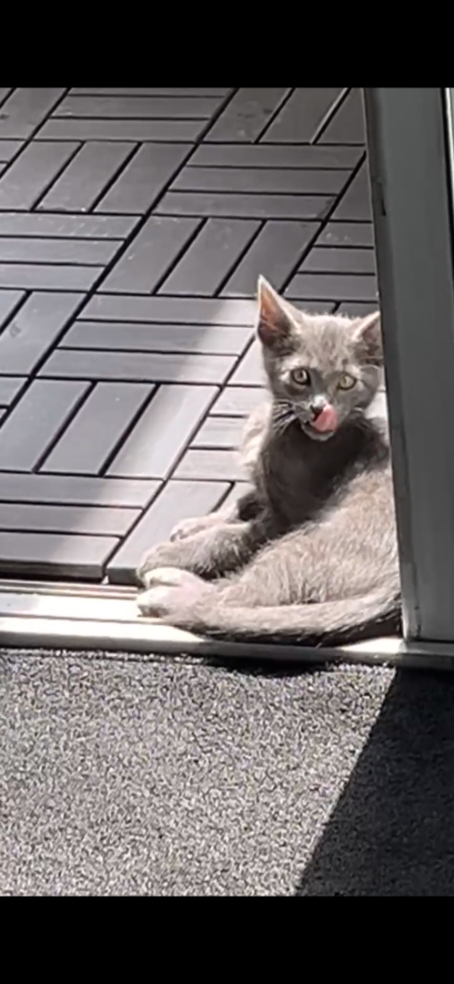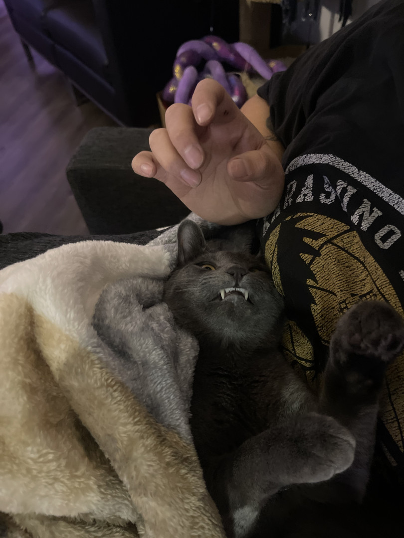 His nickname is tongues (tongue-gis). He has this nickname because when he talks to us and shows his emotions like yell at us, or beg us, or wine, the little tip of his tongue pops out with every meow. He goes on and on talking back with just a tongue.