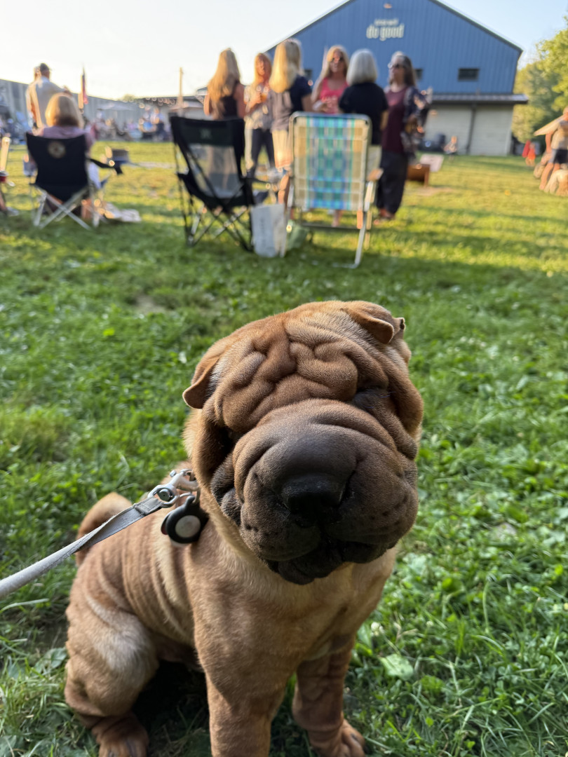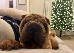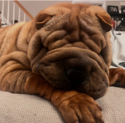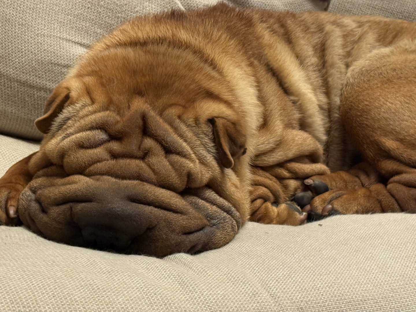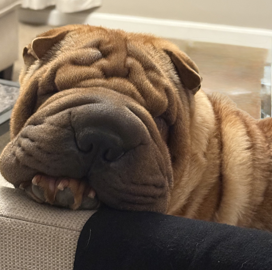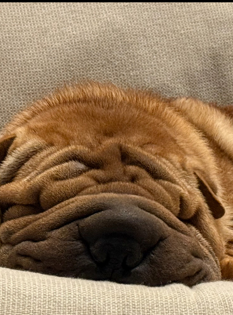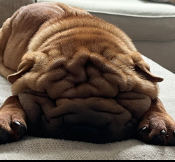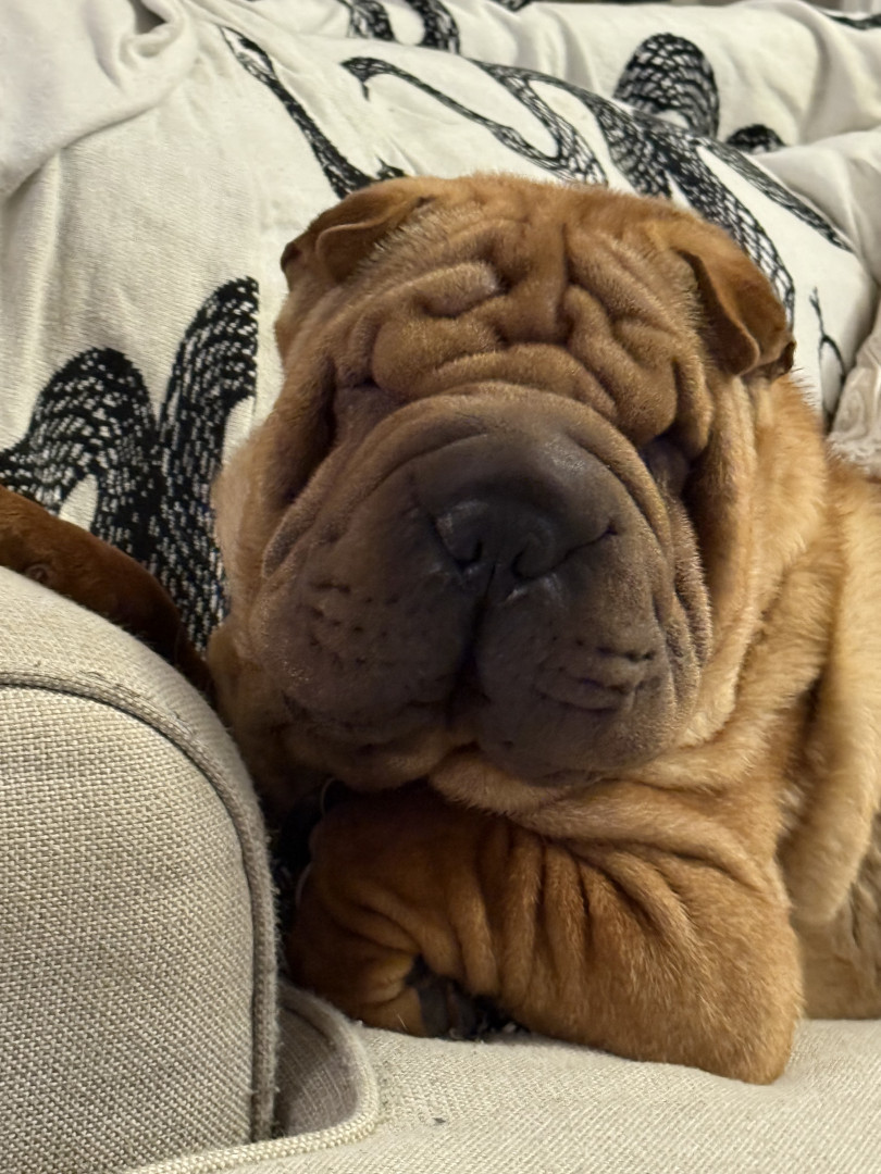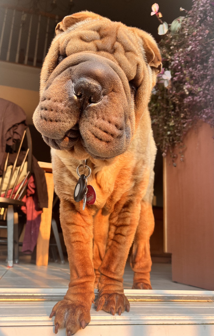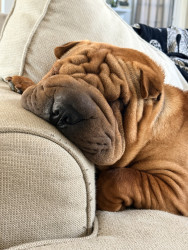 Ocho is a 1 1/2 Chinese Shar Pei. She has a hard time seeing but loves batting around a tennis ball.
