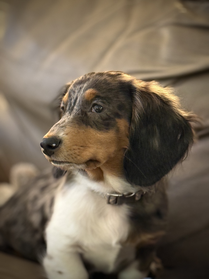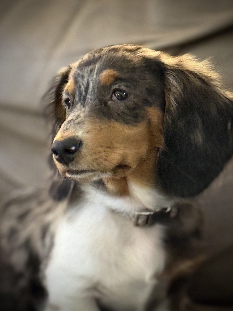Odie is a spicy lil mini dachshund pup. He is a dapple. We rescued him in November 2025.