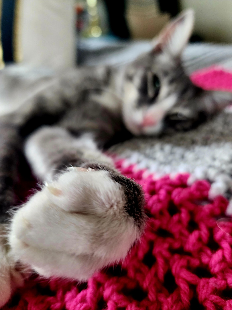 Olive is quite striking, with luminous green eyes and a beautifully blended coat—part siamese elegance, part grey tabby charm. Her coloring suggests soft, creamy tones paired with subtle grey striping, giving her a refined yet cozy look, and she carries both mystery and warmth in her presence. Simply purrfect!