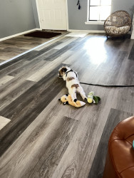 He gets lots of attention when walking out and about on leash, is walking up to 5 Miles every morning…contains quietly to himself around others dogs… unless allowed to play…
