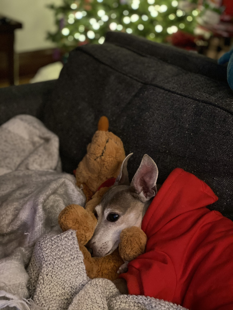 Learn MoreFavorite toy is a plush "Max" (dog from the grinch) which she used to steal every Christmas season when I would bring out holiday decorations. She would run around the house with him and bring him to different spots to play and cuddle. Max still is her favorite to cuddle but now he stays out year round. Her go to treat these days is dried minnows but she loves to chew on freeze dried turkey necks and rolled dried fish skin sticks.