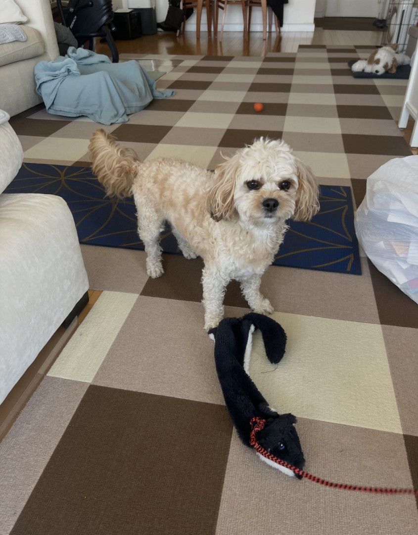 Ollie has an obsession with one toy and one toy only. He has a whole pile of things we’ve gotten him, but he incessantly asks for this things that’s like a cat wand but for dogs. So it’s a bit larger. He cries when it’s put away. He looks at it when it’s untouched. He whines and looks at you so that you go get it. And you can’t just hold it, you’ve got to run, you’ve got to go crazy. He’s very specific.