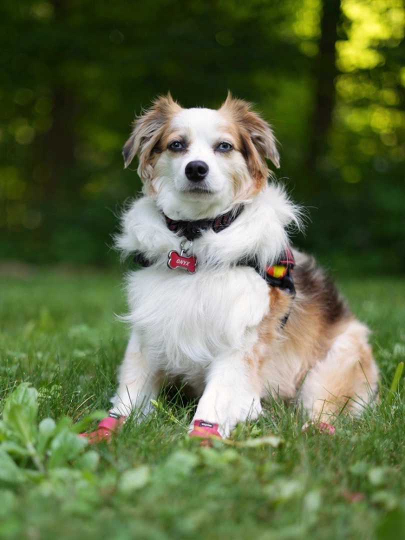 Onyx is the sweetest little Aussie shepherd who loves nothing more than getting attention and making people feel welcome and comfortable. His coat pattern is unique as he is a blue Merle but has copper tones instead of the standard tan/grey