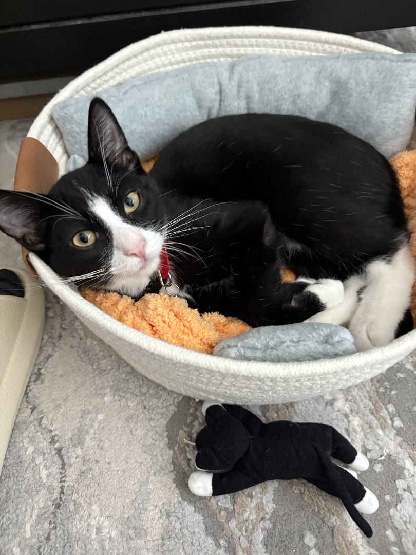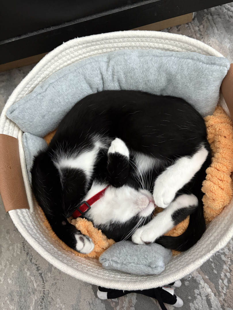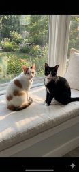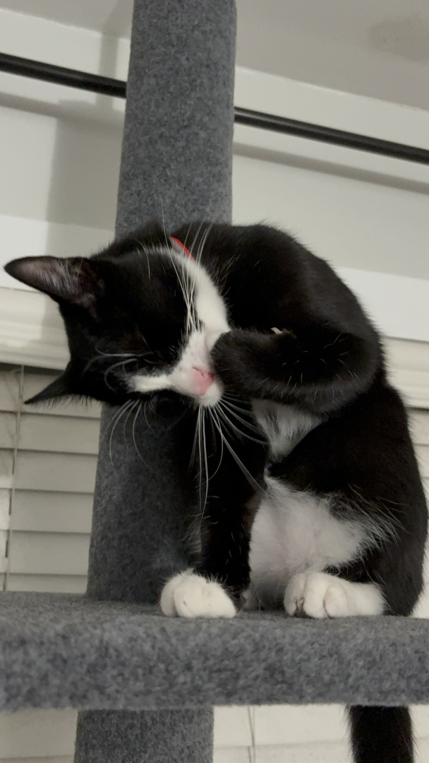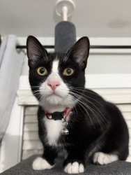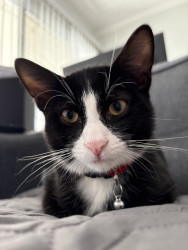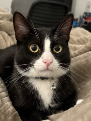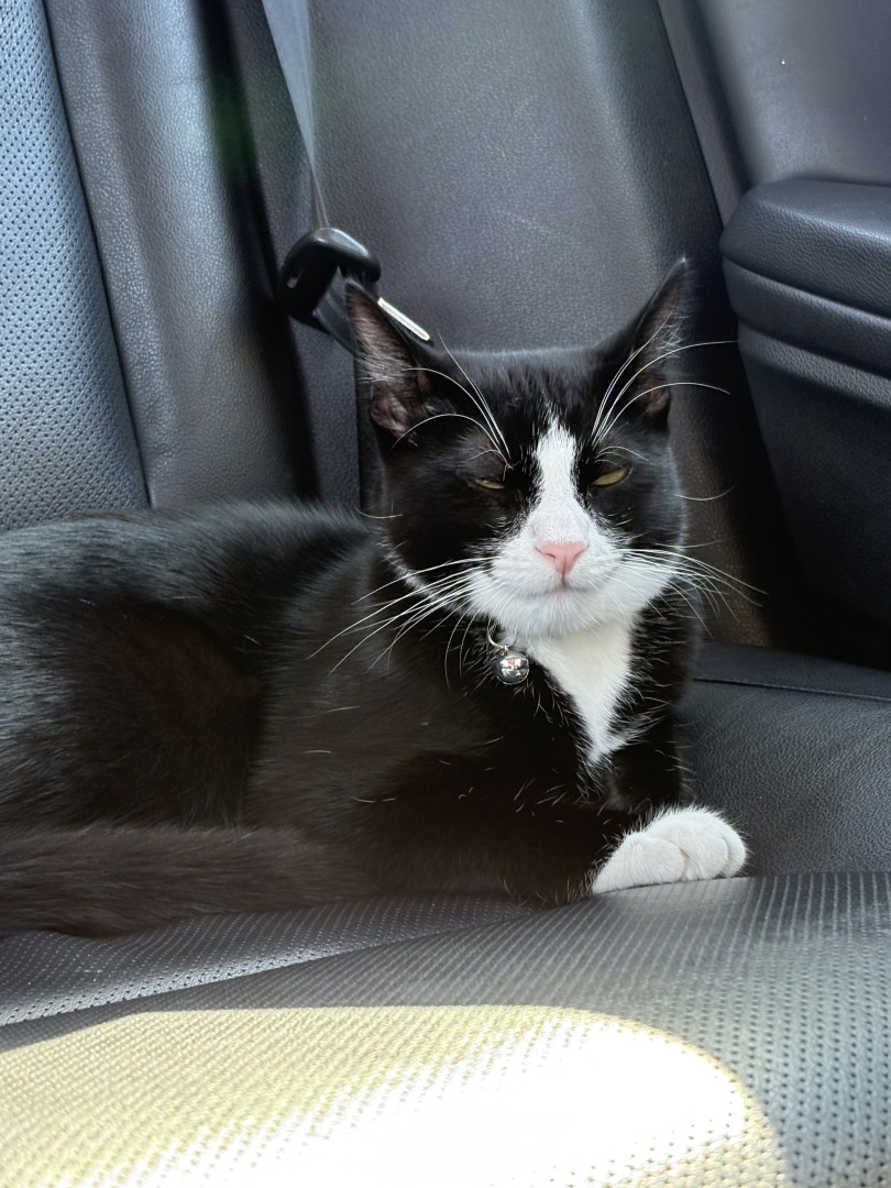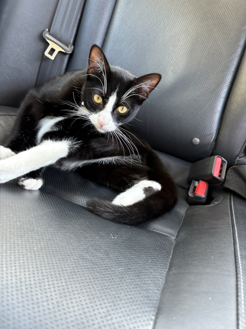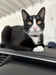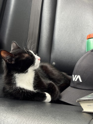 Oreo is a tuxedo cat who loves cuddling and going out for a car ride. He loves to watch squirrel from his window on our living room.