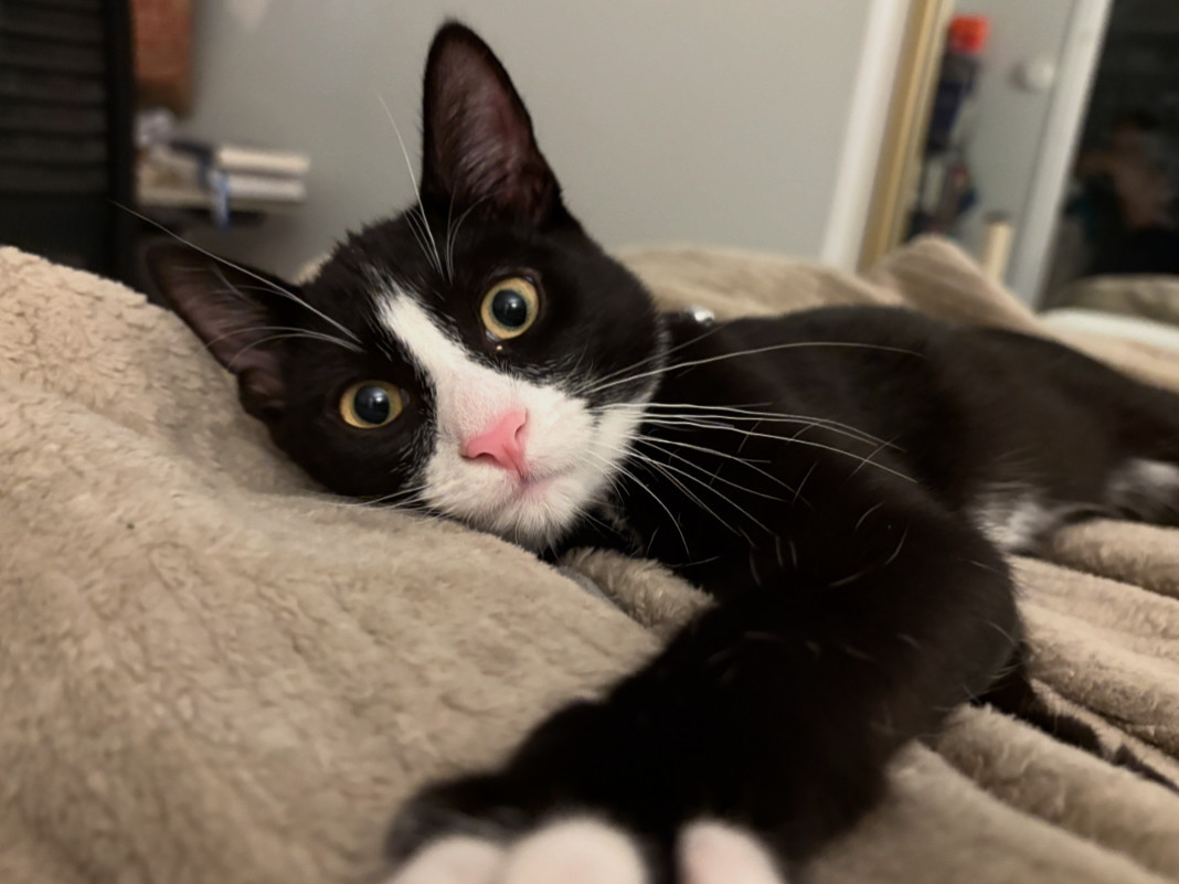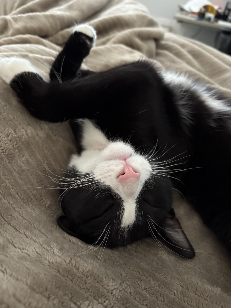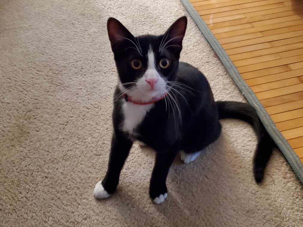 He’s wearing a perfect tailored tuxedo 24/7, he’s always running towards the window to greet people and animals, he has self awareness the moment he escaped the door for 5 minutes, he couldn’t survive any longer so he went back home before the door close, and he can tell the quality of the boxes by biting on them. He will help people to wake up at 3am sharp so they won’t be late to go to work.