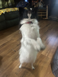 He will stand on his back legs and dance around begging with his front legs. Loves to play catch with a ball or toy and can run like lightning. He is super fast when he runs his zoomies. Will run through the house and jump from the couch to the chair the run to bedroom and run across the bed and back to living room again. He is super fast.