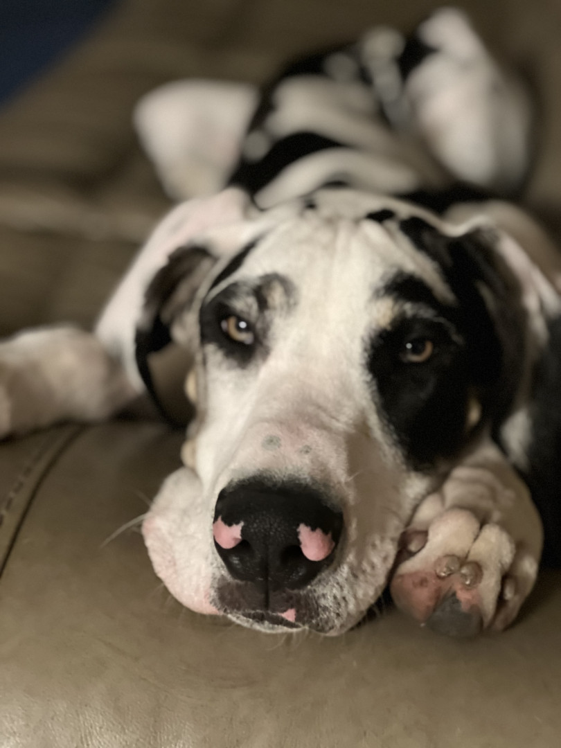 Oscar is an 8 month harlequin Great Dane. He thinks everyone is his friend and has no idea of personal space. :)