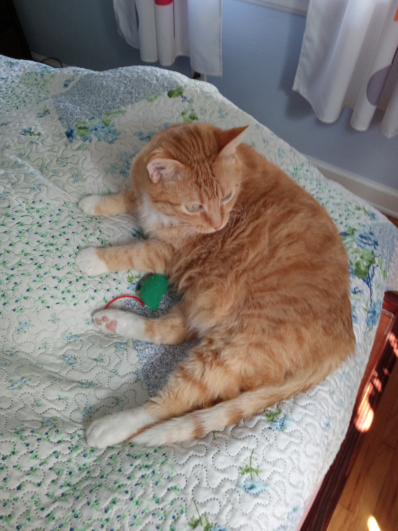 Learn Morehis felt stuffed mouses he loves them, when he hears popcorn poppin he comes running for some, 2 pieces are his limit.