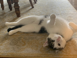 Our Otis is a Magpie that loves his food. He is so wonderfully weird. He loves to loaf in the sun and gives his Schnauzer sister baths.