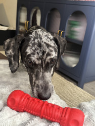 Learn MoreHe is obsessed with his rubber kong toy. He loves having it thrown to him but once you start you now have to throw it 20 times!
