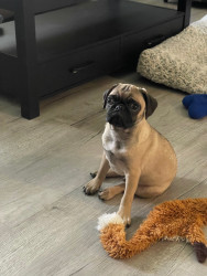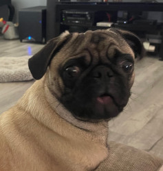 Ozzy is a very rambunctious, loving, and protective of his Hooman's, especially when the doorbell rings! He is our prince of pugs!