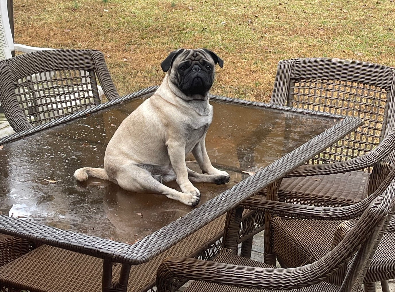 He loves to get up on our outside table and then can’t figure out how to get down.