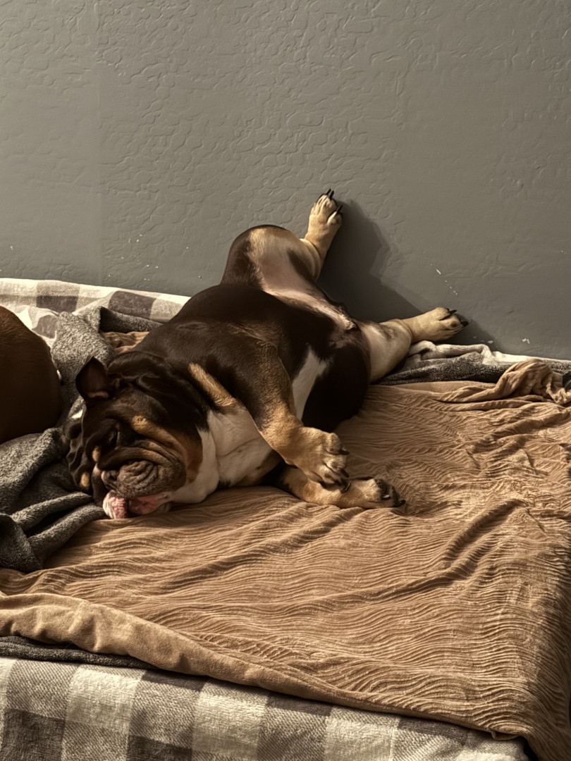 He looks like a tough guy but is actually a professional cuddle expert. This chocolate-colored English Bully has mastered the art of being intimidating and adorable at the same time. He believes he’s a lap dog, a comedian, and a therapist all in one. His expressions are human, his heart is huge, and his mission is simple: love everyone and be loved back.