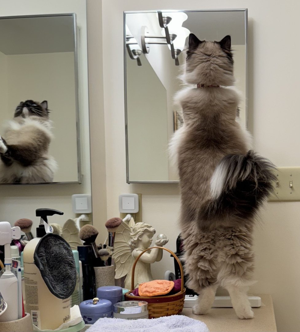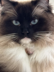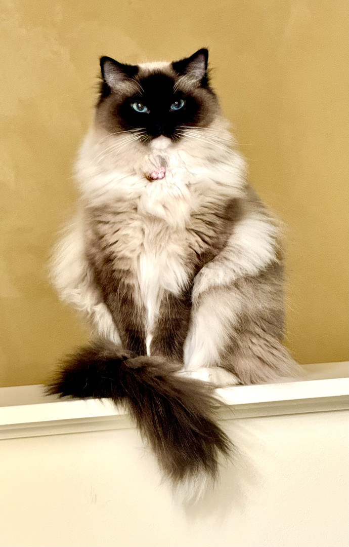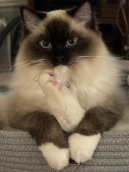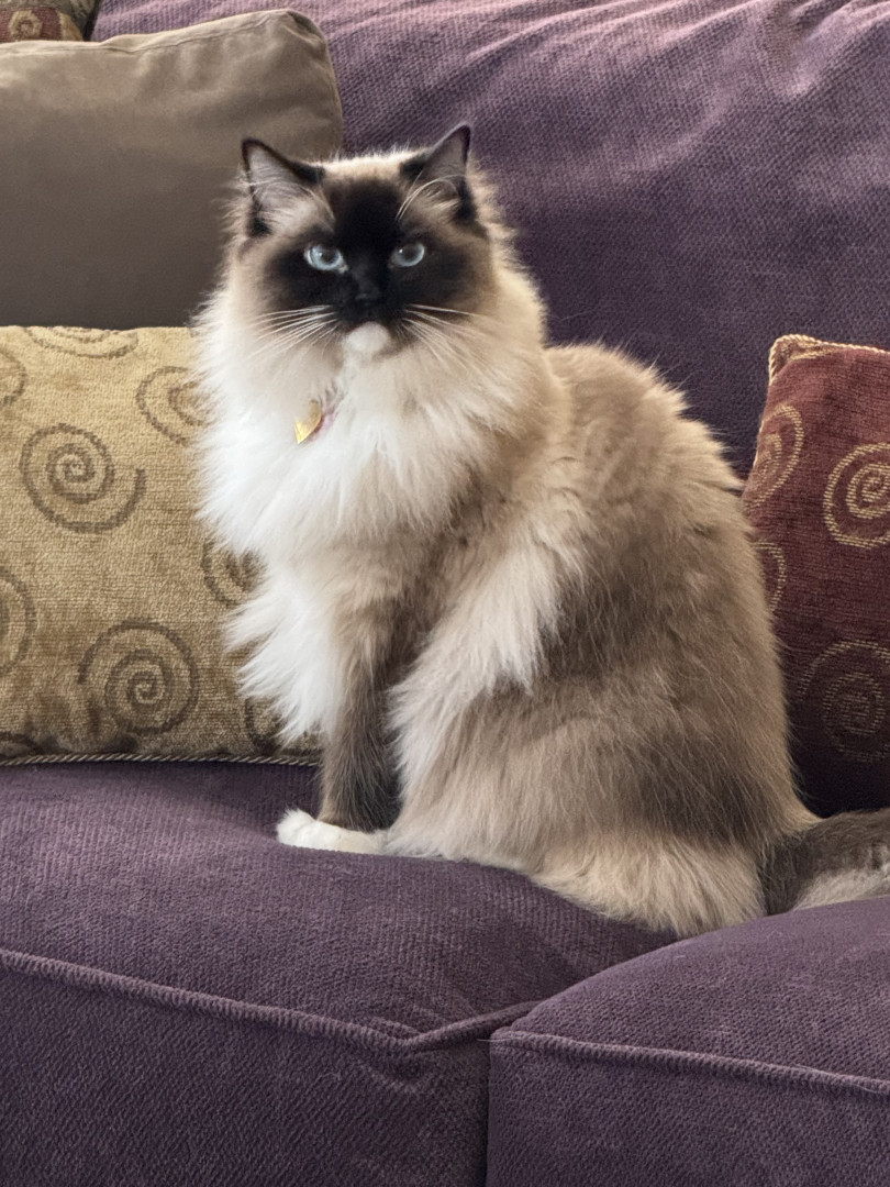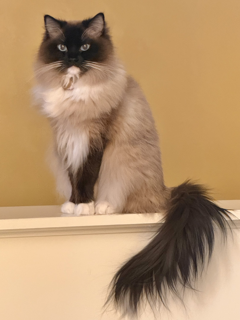 Paisley has a tuft of fur on her tippy tail that is completely white. She is with me when I am up all day watching my every move, she likes to help! She adapts well to travel and visits to her cousins house with 5 other cats.