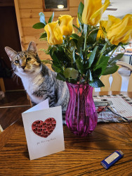 Sweet, loving calm nature. Rubs on me and insists on treats. Sometimes tries to interrupt me on purpose to get my attention.