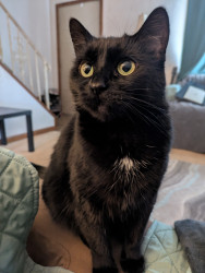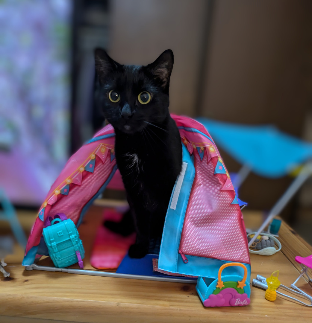 Pancake is the guardian of the stairs, and the slayer of strings. She chirps like a bird and will steal your popcorn. She's our floof.