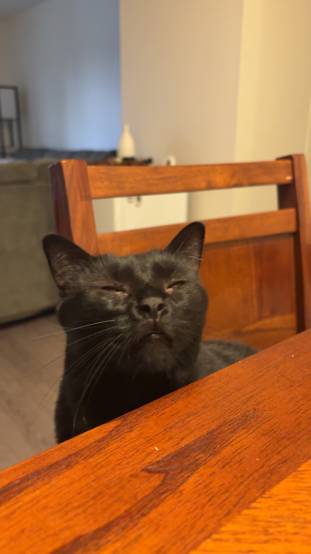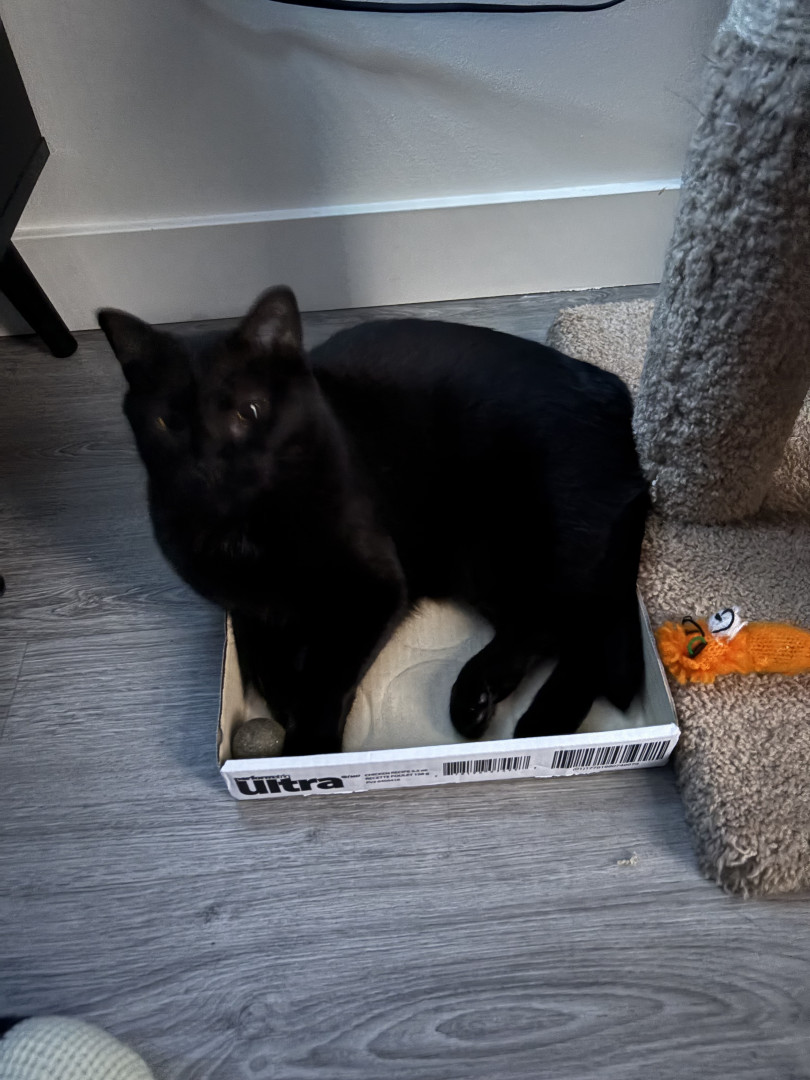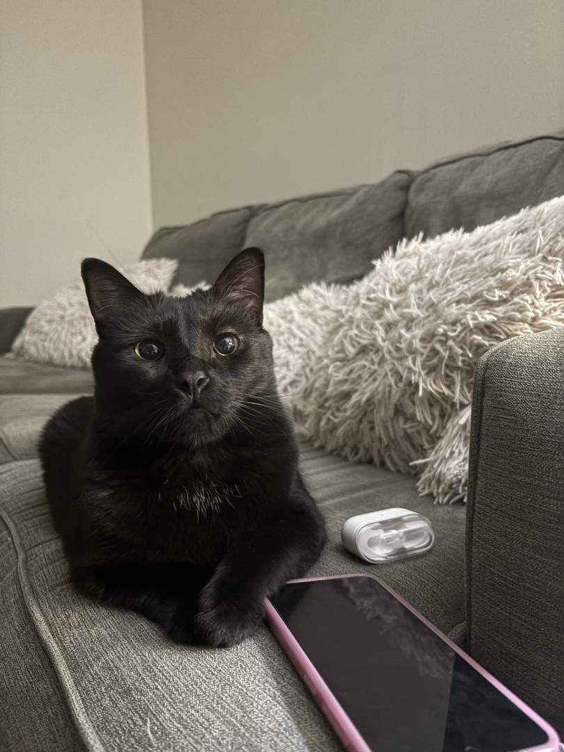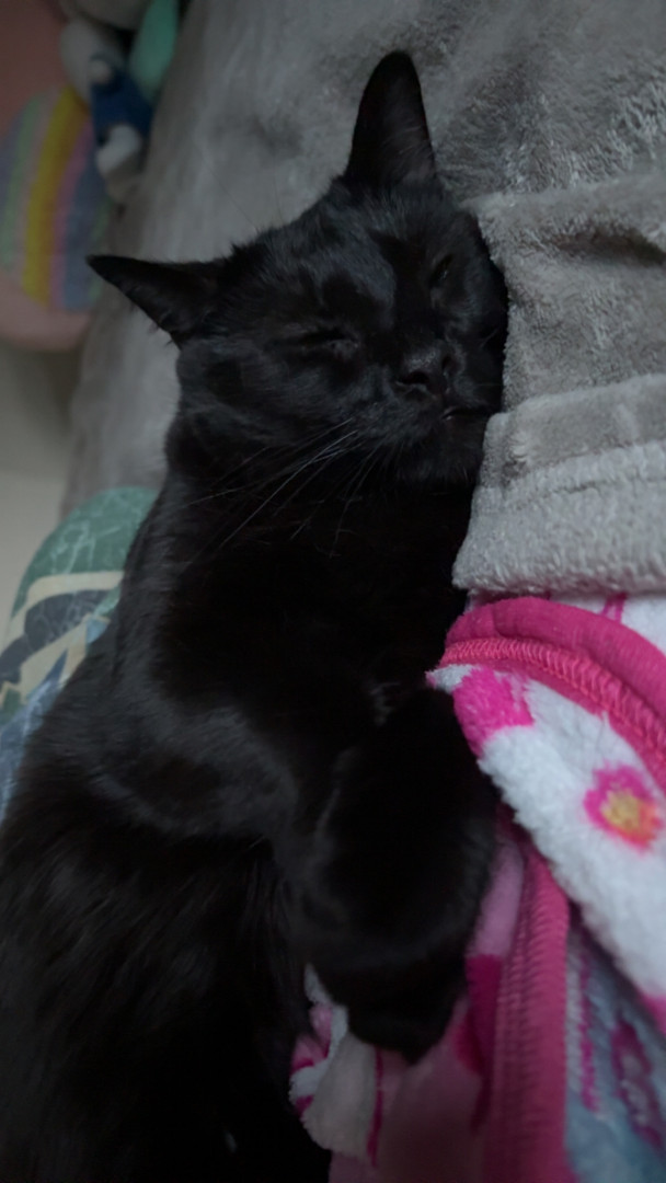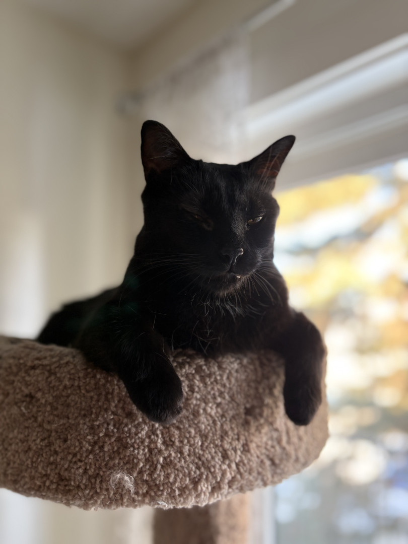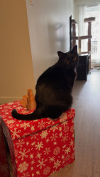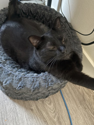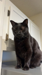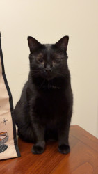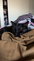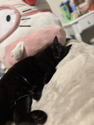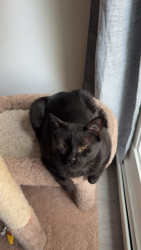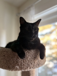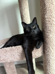 Pandora is a female black cat, she’s loving and cuddly, vocal and energetic, sassy and proud, needs attention, loves people, loves napping