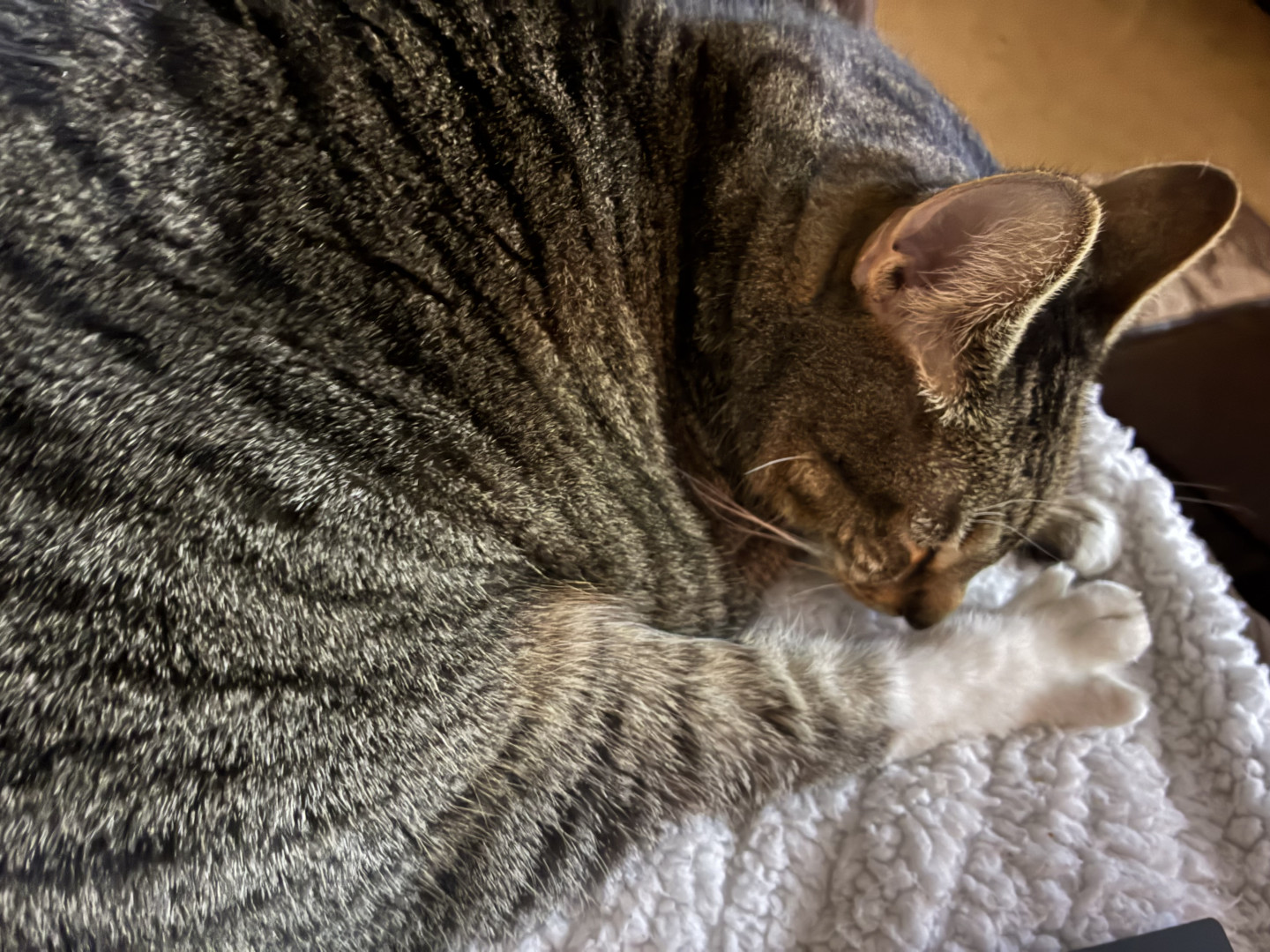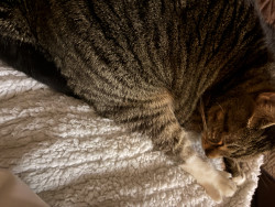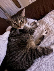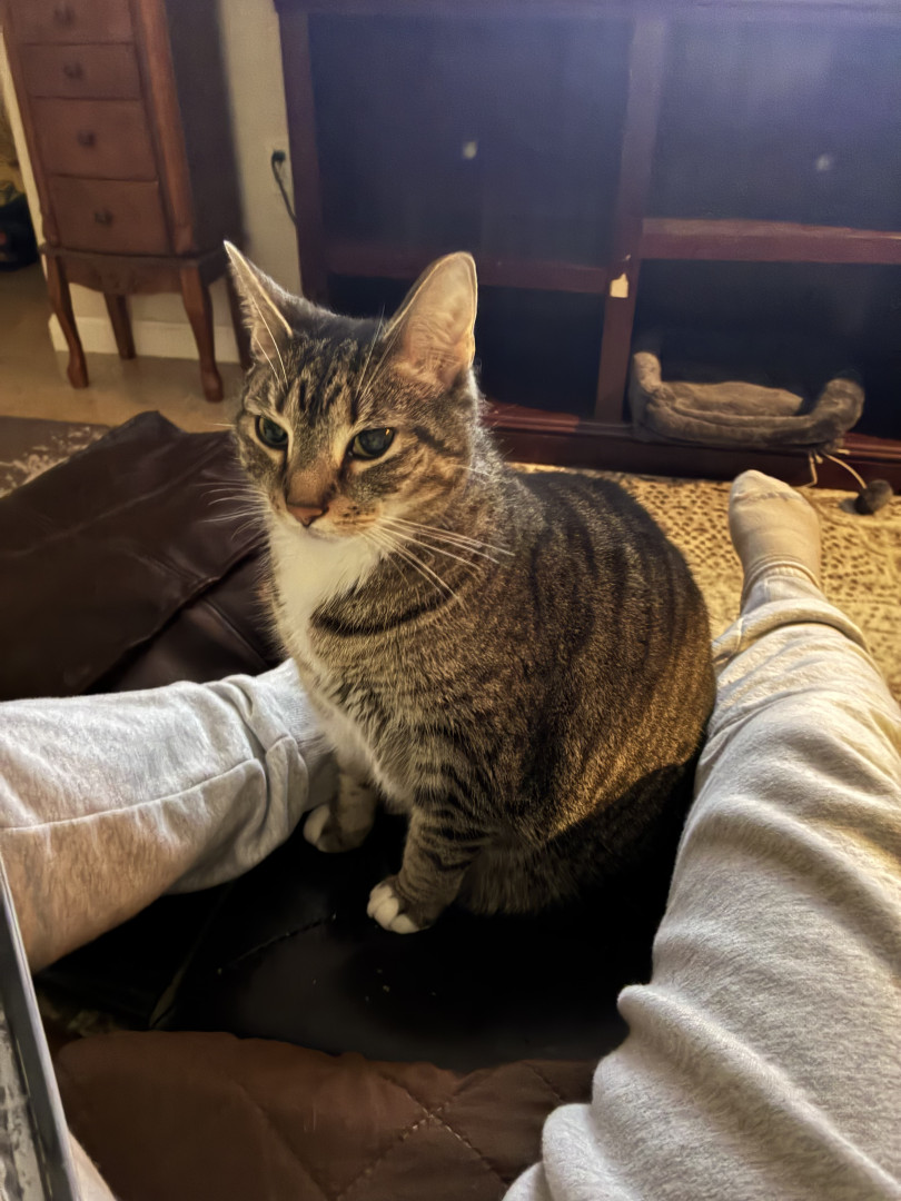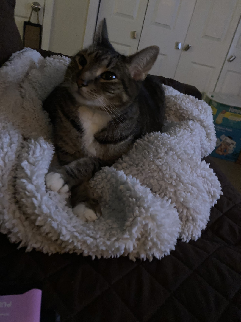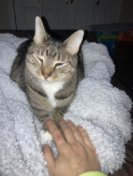 She’s a well tempered ball of joy, good with other cats and other humans. She poses for the camera, has a broken tail and stays happy no matter what along with her spinabifida she’s a force to be wreckened with and gets her name Paris from being a ball of LOVE!