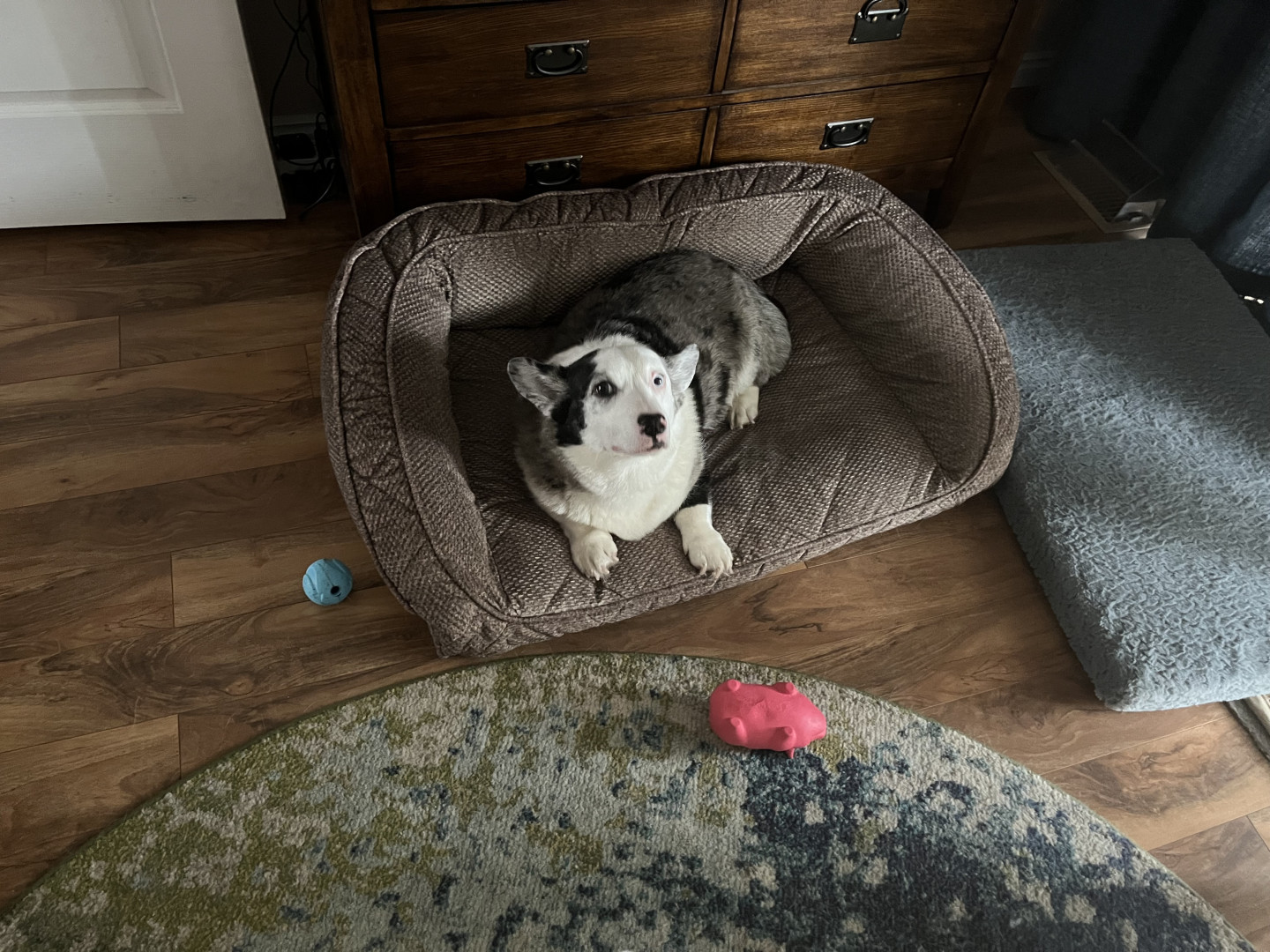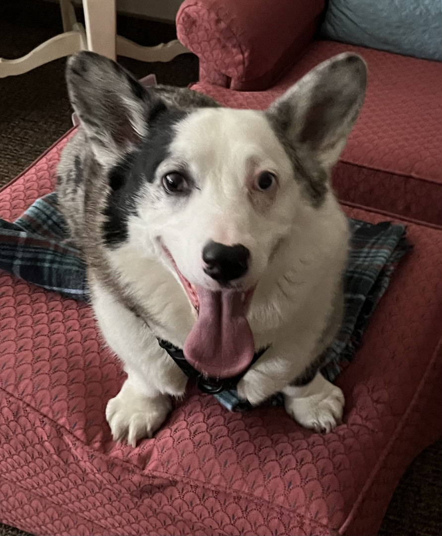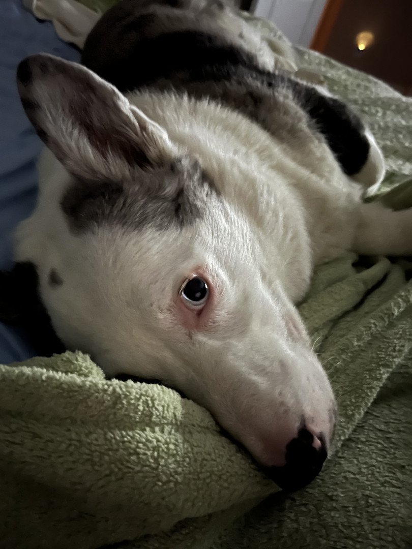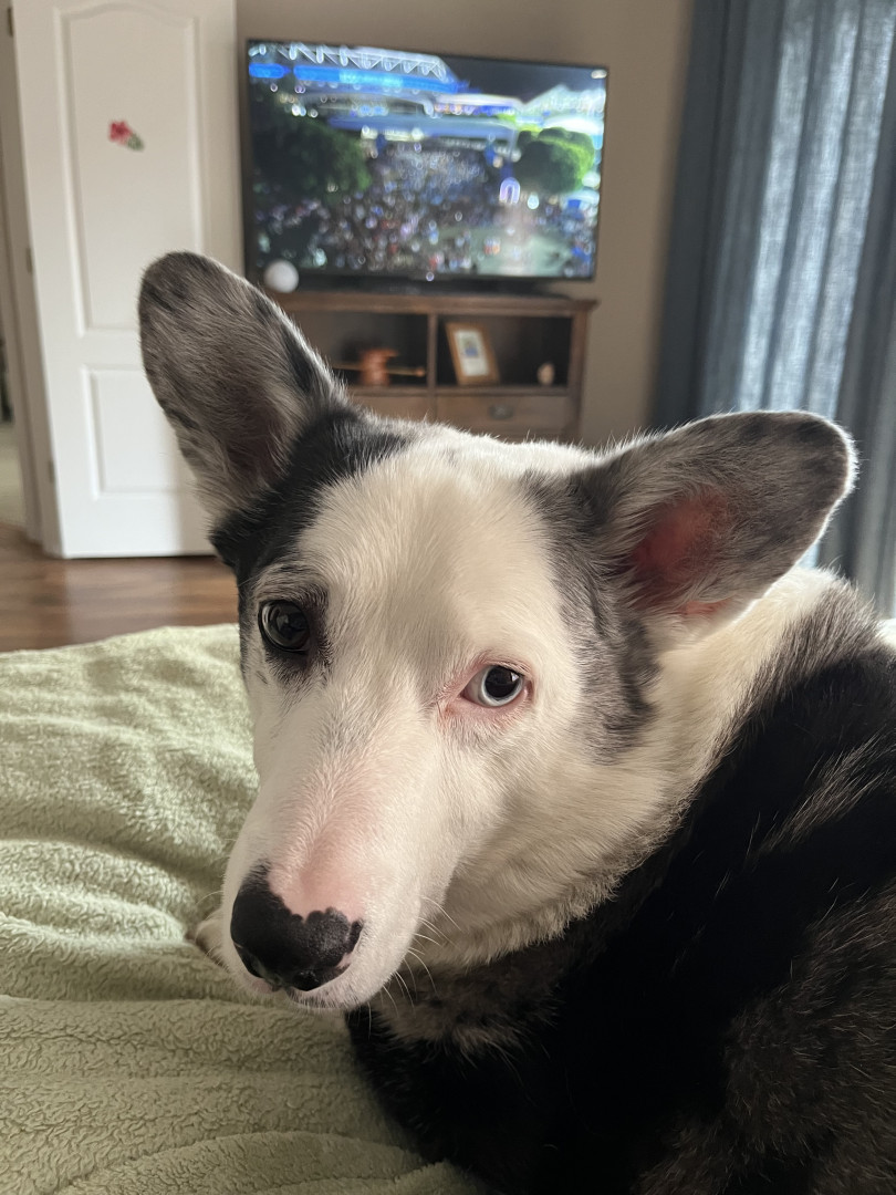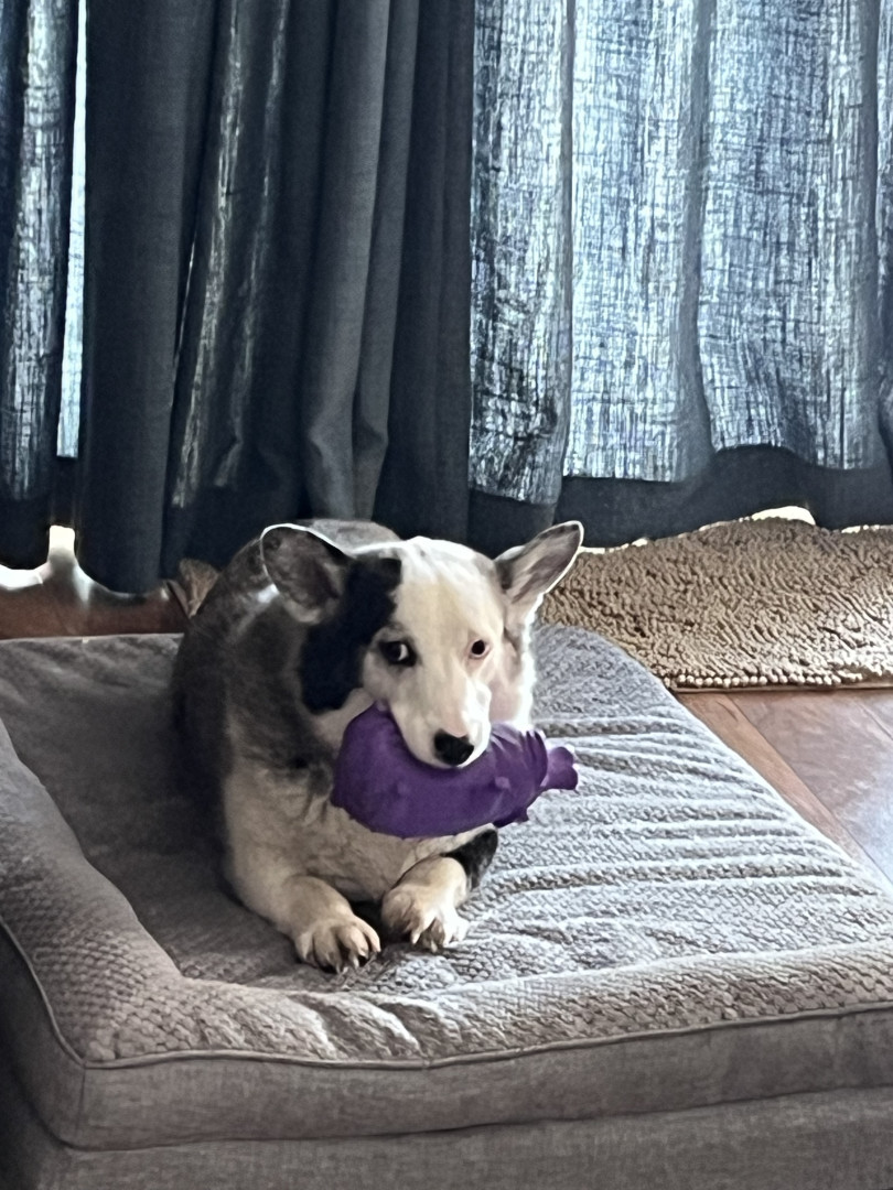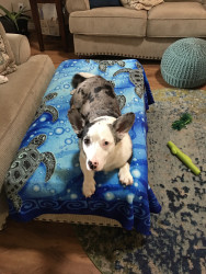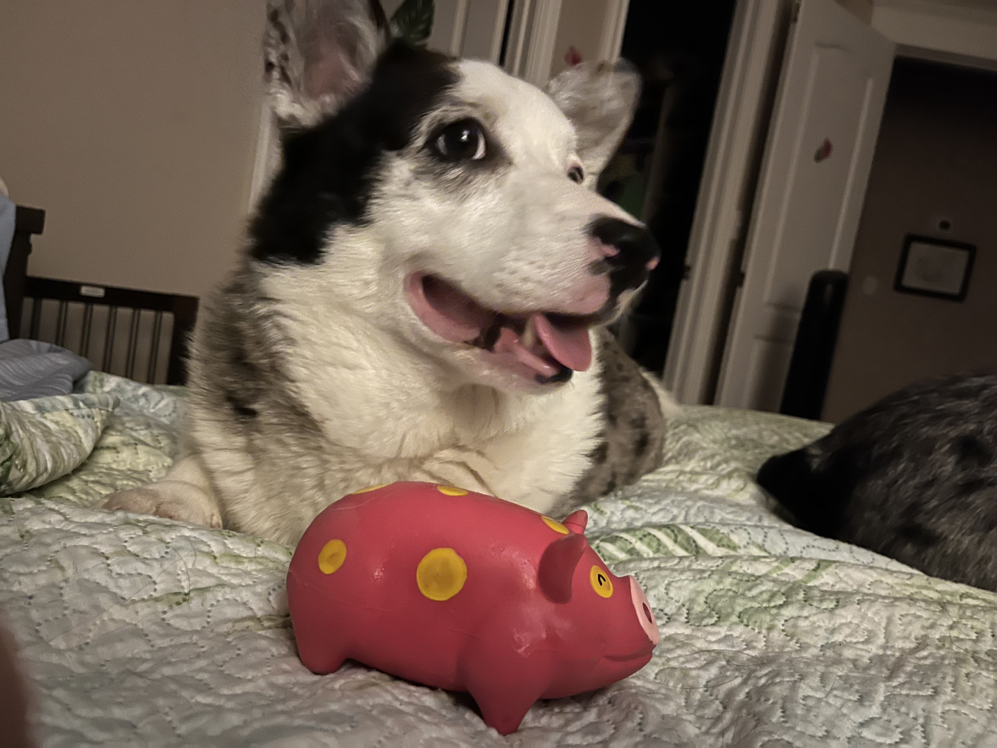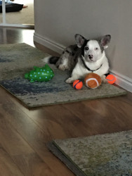 Patches, he will follow you everywhere! Loves fetching balls, toy pig, gentle soul who loves to parade around for attention. Avid TV watcher