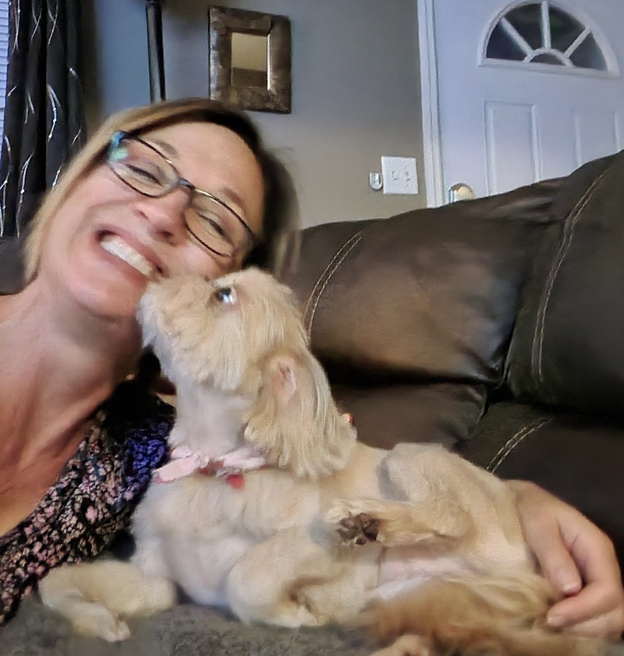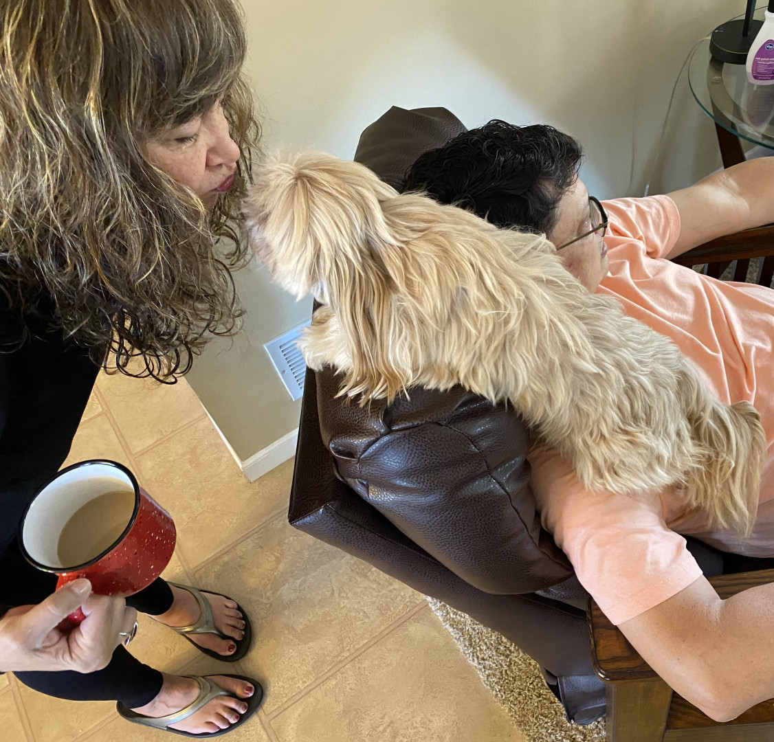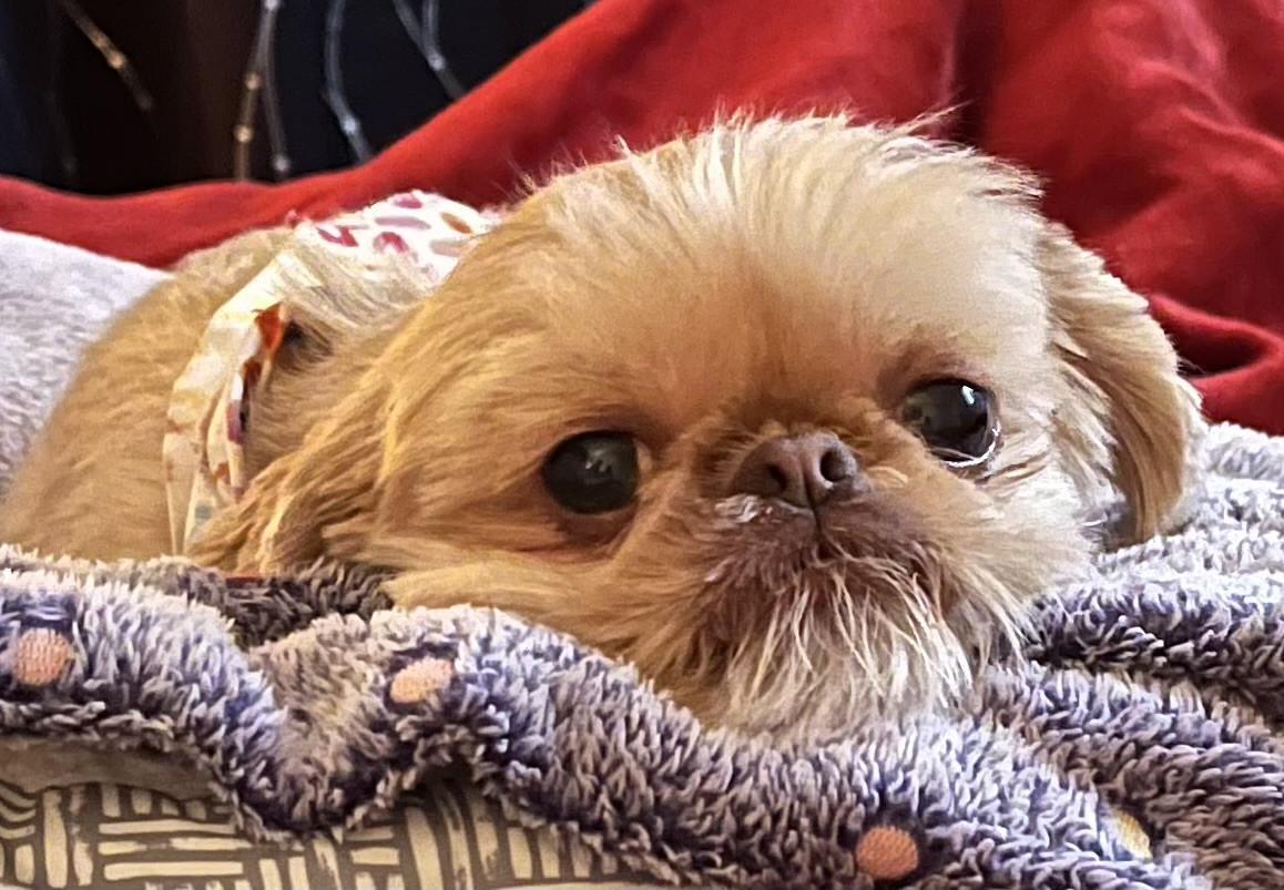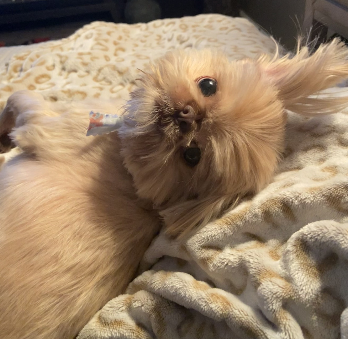 She is truly a lanky long legged Blonde that dances tall up on her hind legs - with her fore legs high in the air waving and crossing in front of her face in excitement when her mom comes home! And, she has the biggest eyes & most expressive face! Oh - and did I share - Peaches loves coffee! Mommy doesn’t give her coffee but she can have a lick of my finger. Especially if the coffee has eggnog in it! 😋
