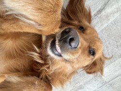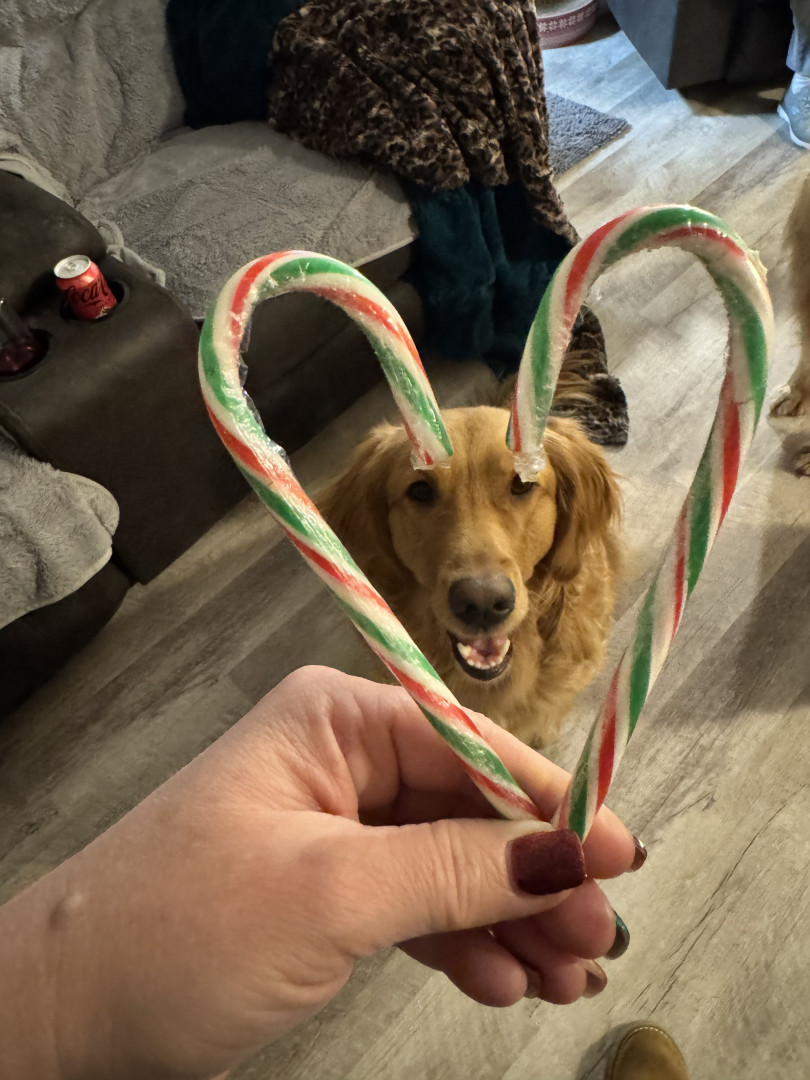 Peaches loves to go for a ride to the local coffee stand & get a milkbone! She loves her stuffies, but her brothers will rip them up if they get ahold of them.