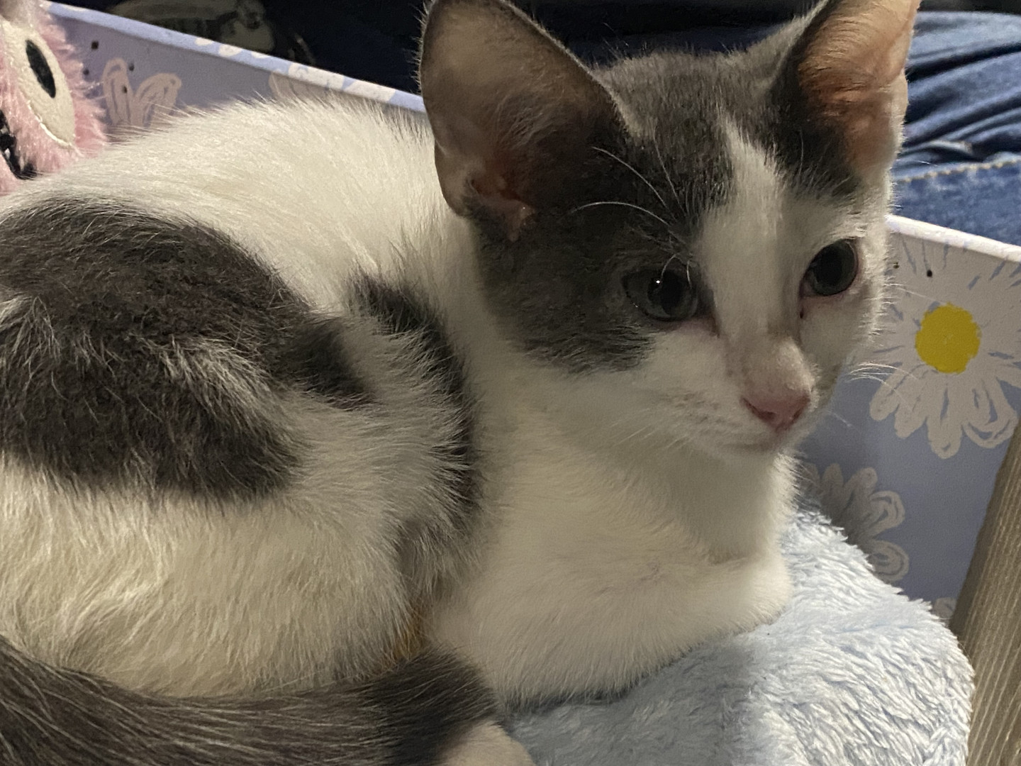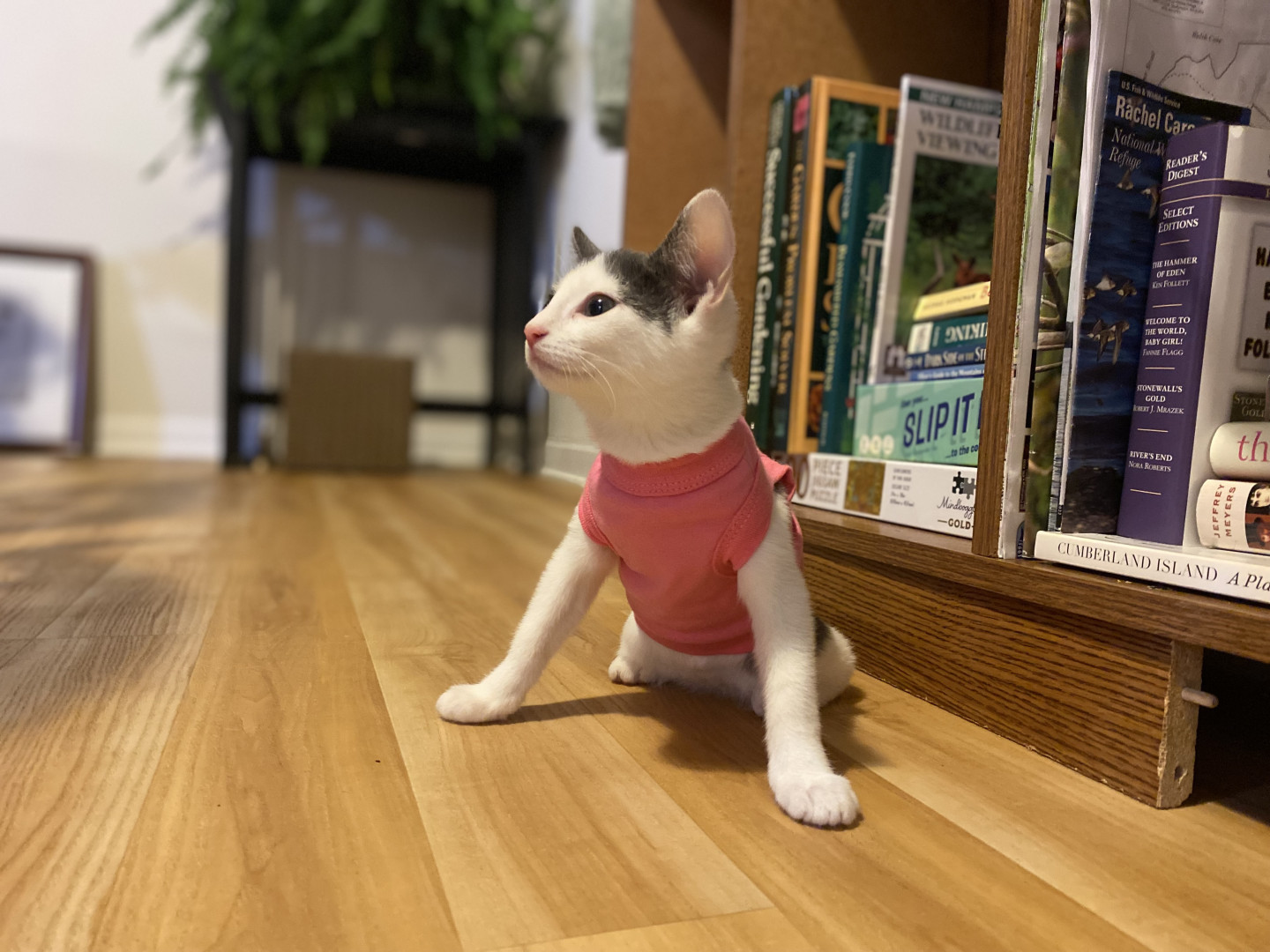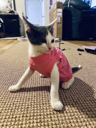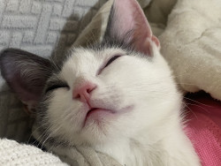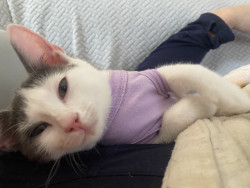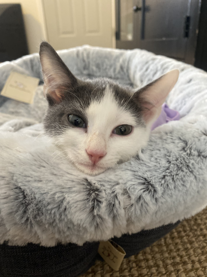 Besides her CH balance issues, she’s not only sweet, but she also is feisty and won’t let anything stop her. Her bunny hops help her close the gap when trying to get from here to there, and when she tires (it’s exhausting when you have to think harder that most kitties and have to try over and over to move event one food) but if there’s food around, she’ll just plop on her side and keep eating. Problem solved, belly full.