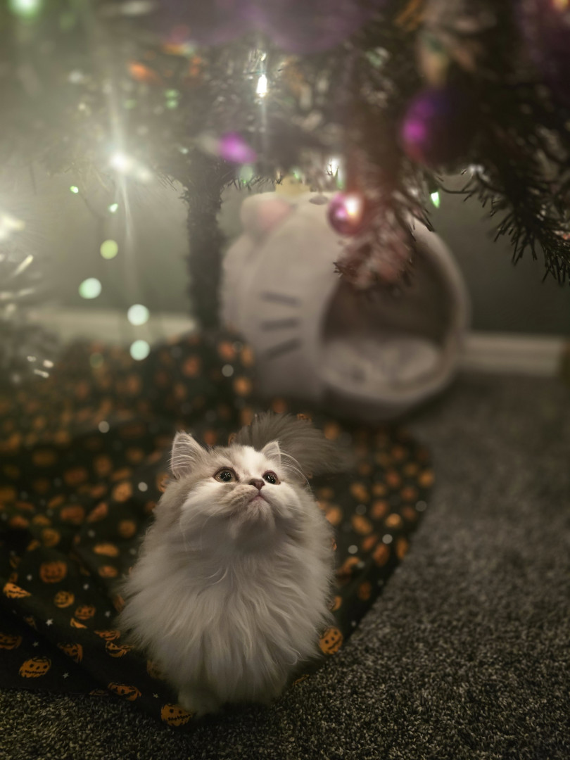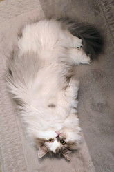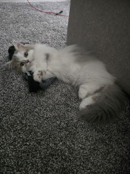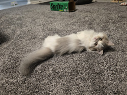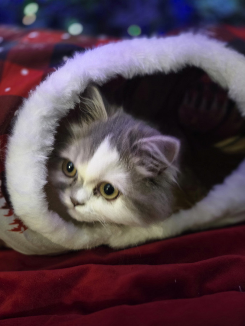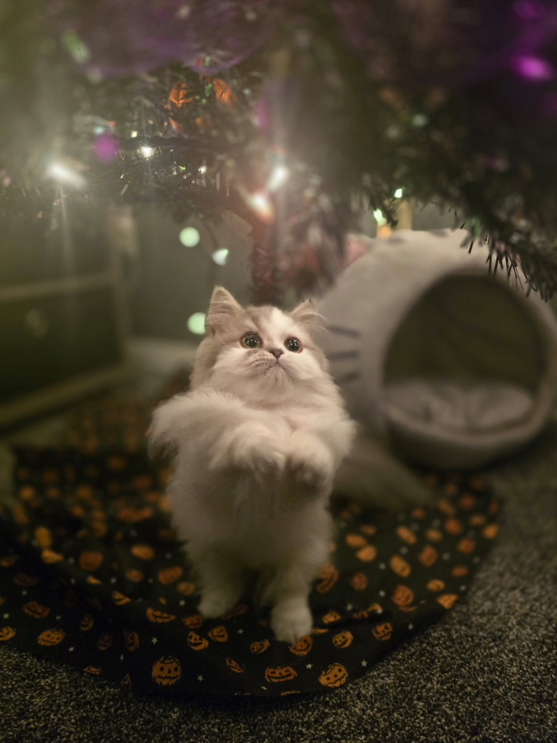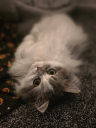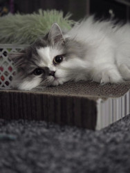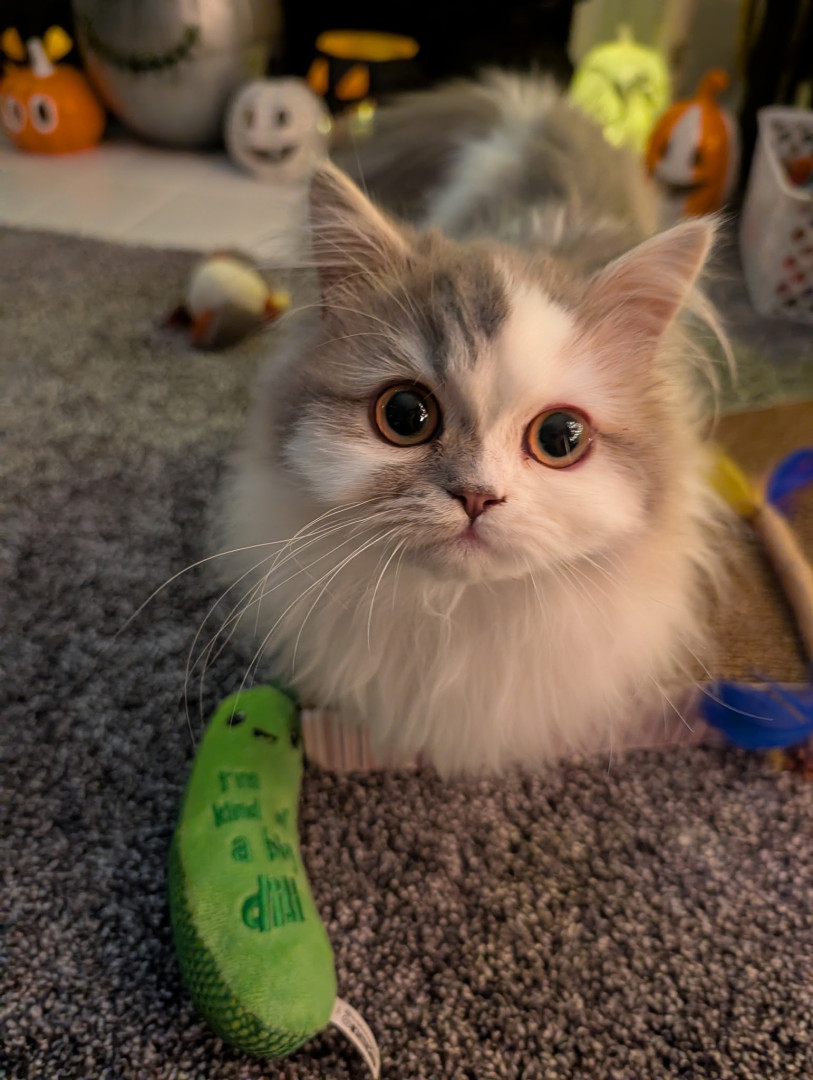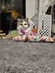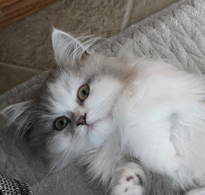 Pebbles is an 8 month old Minuet kitten who inherited her short legs from her Munchkin dad. She is playful, curious, and loves people.