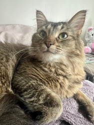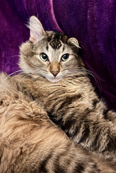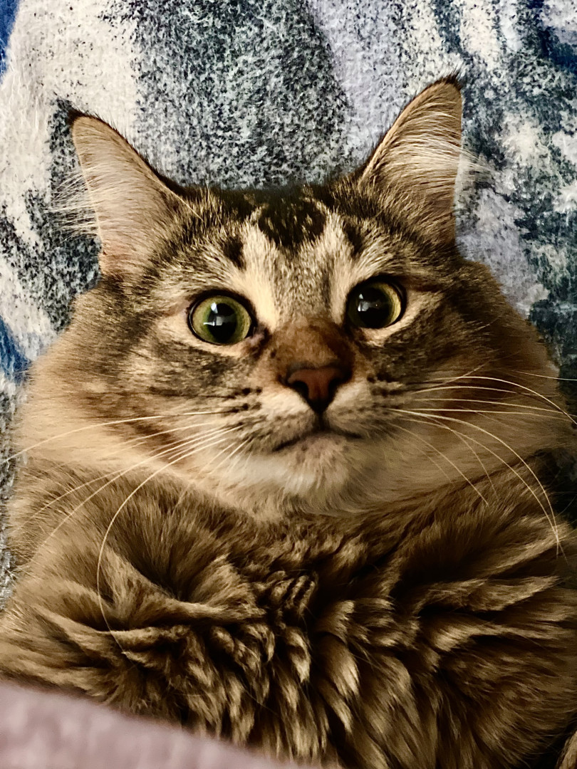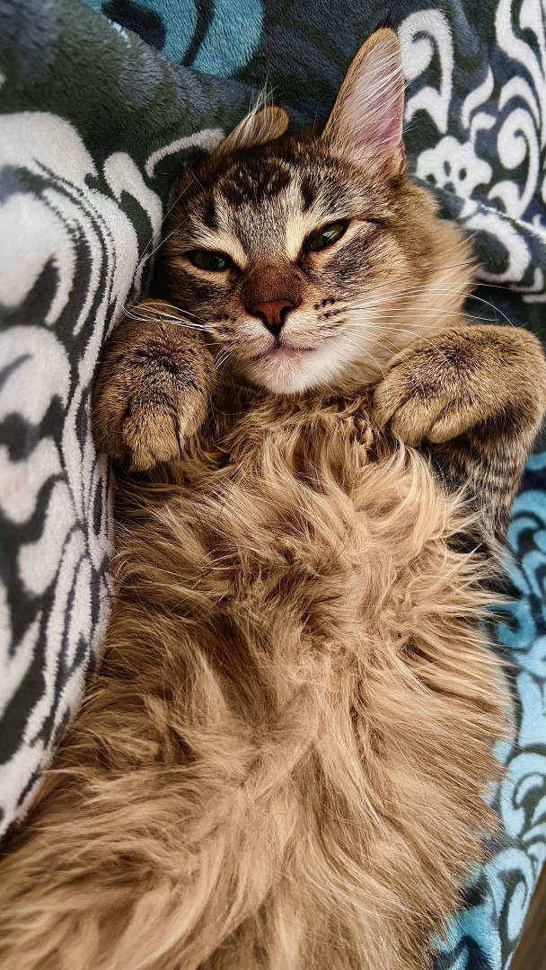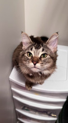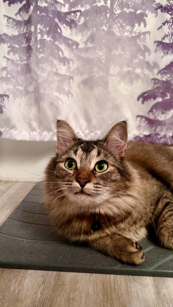 Lovable, fluffy, and totally adorable, this 2½-year-old tabby lives for boxes, climbing, and snuggles. He’s the sweetest kind of crazy!