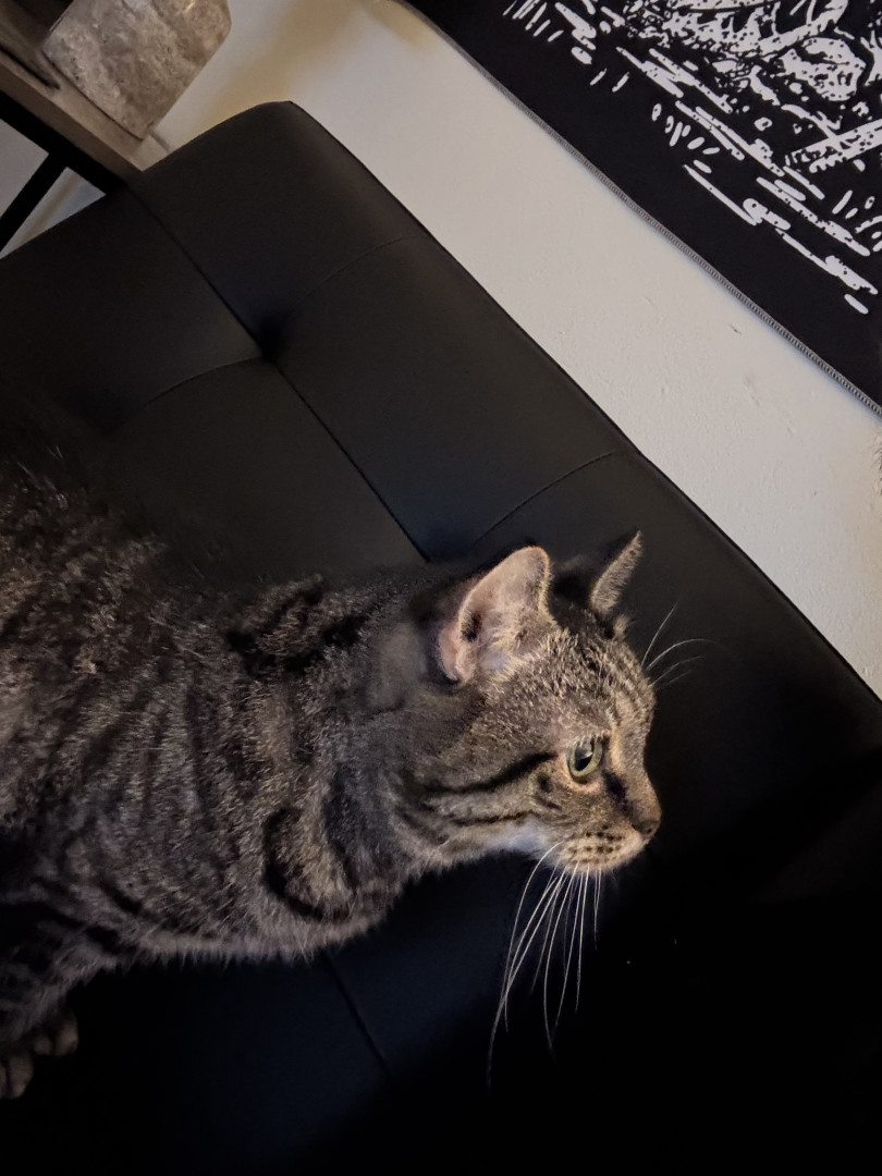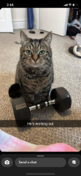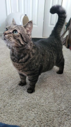 Peewee is a munchkin cat so he has short legs; he has difficulty jumping up anywhere high