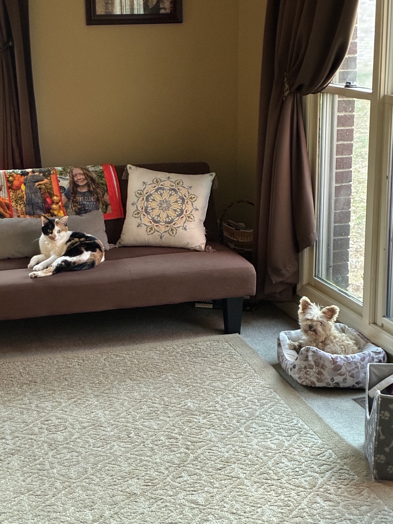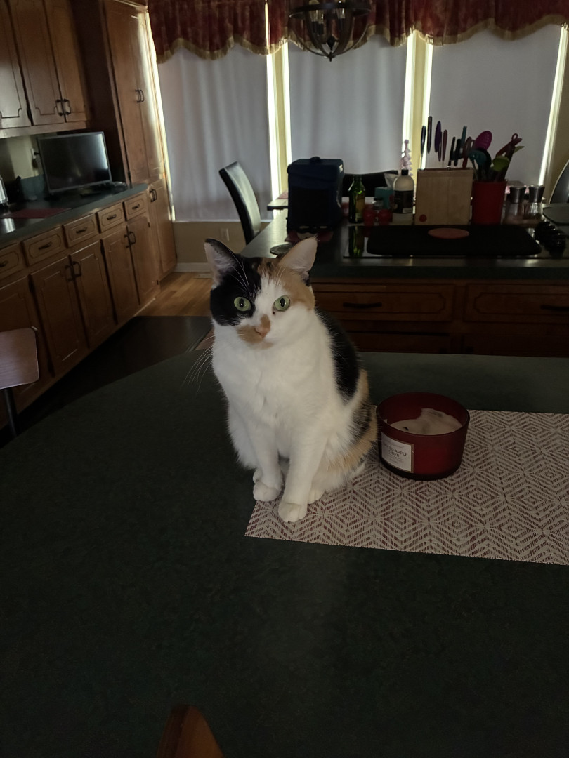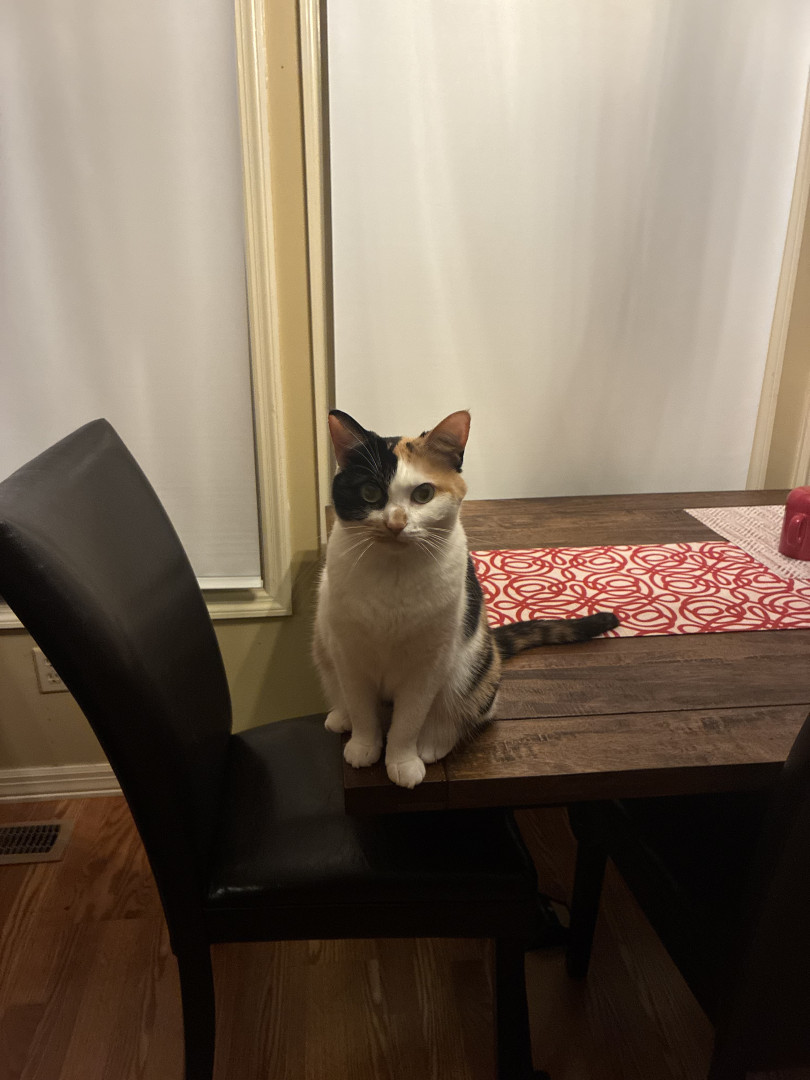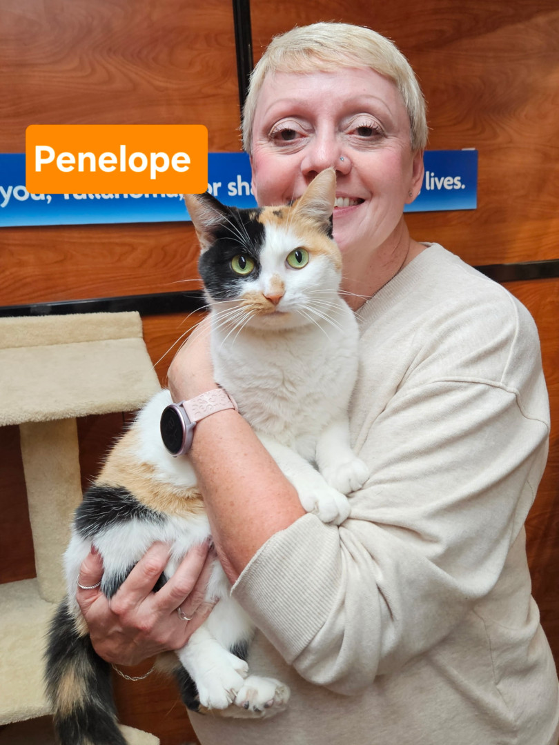 Penelope’s unique quality is her very sweet disposition and the sweet way she puts her little paw on your face and looks you in the eye meows at you. She melts my heart every time, but I have to say her beautiful coat. She’s got the most unique coat for a calico and her beautiful big green eyes