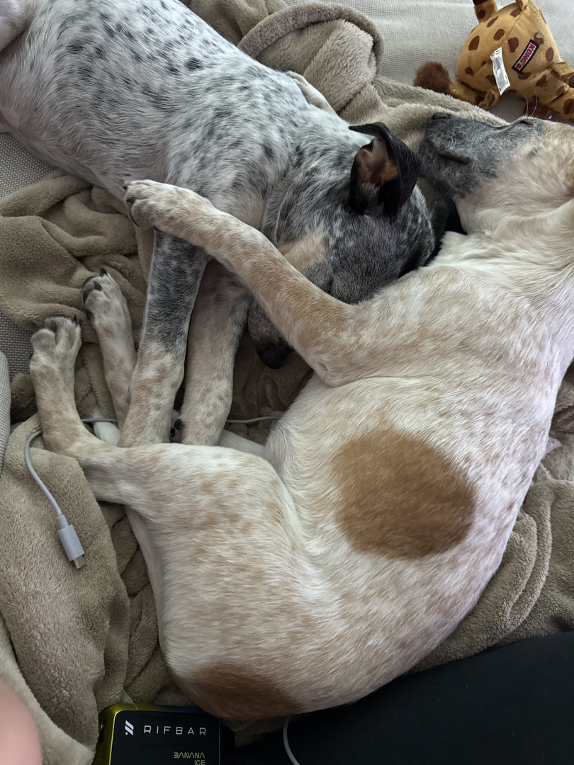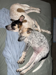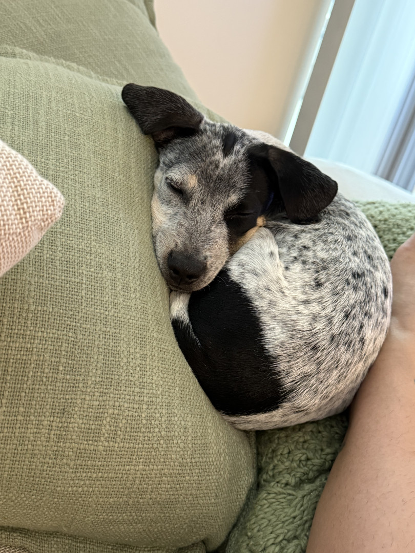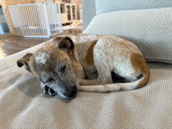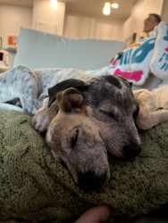 Pennys most unique quality is she’s a back sleeper! she will burrow into the blankets and pillows and roll right on over.