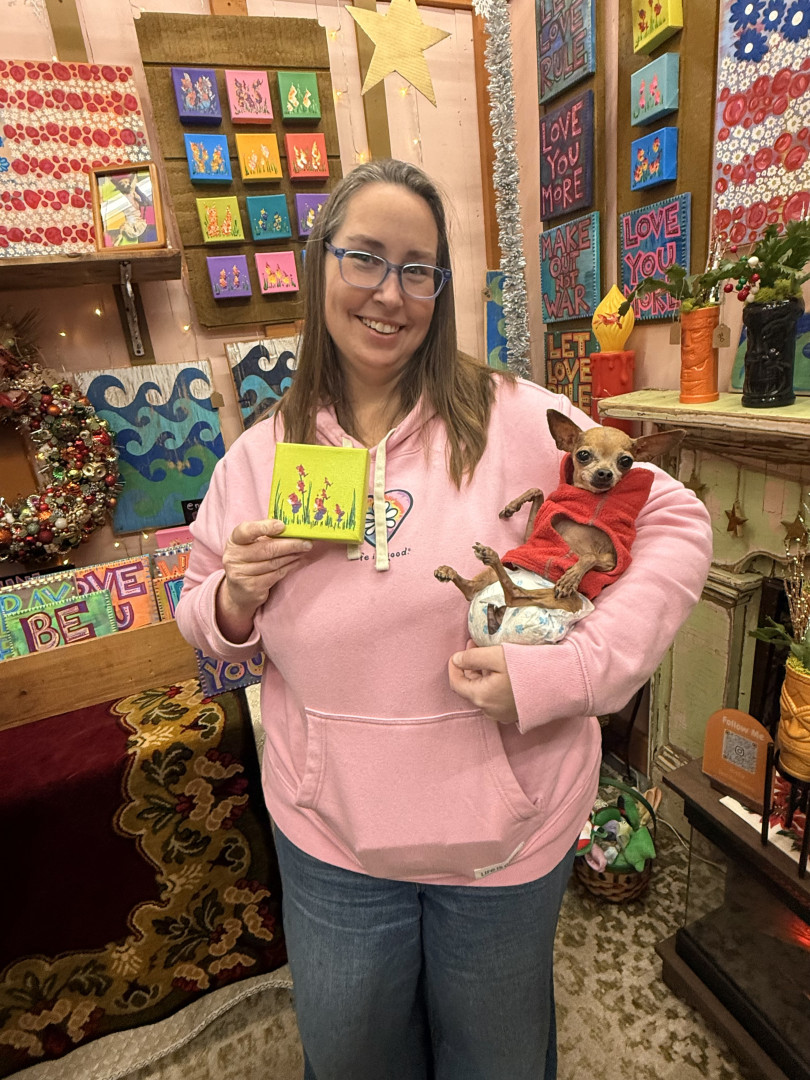 Her most unique quality is her attitude! Despite being paralyzed after an accident, there is nothing this little girl won’t attempt! We started making paw print flower paintings with her paralyzed feet to help share her story and find a way to change the negative narrative regarding handicapped animals. We call Karen handi-capable and she inspires so many with her positive attitude and love for life. She is truly unstoppable , a girl with big dreams, I’m just happy to help her achieve them!