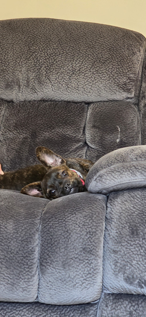 Shes a unique mixed breed. 57% French Bulldog and 20% Chihuahua with 2% in some other smaller breeds. Brown brindle is her color and it keeps changing. She's beautiful.