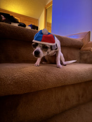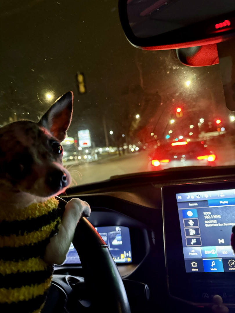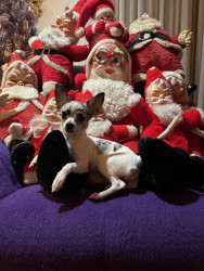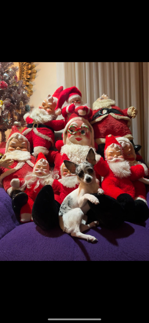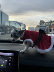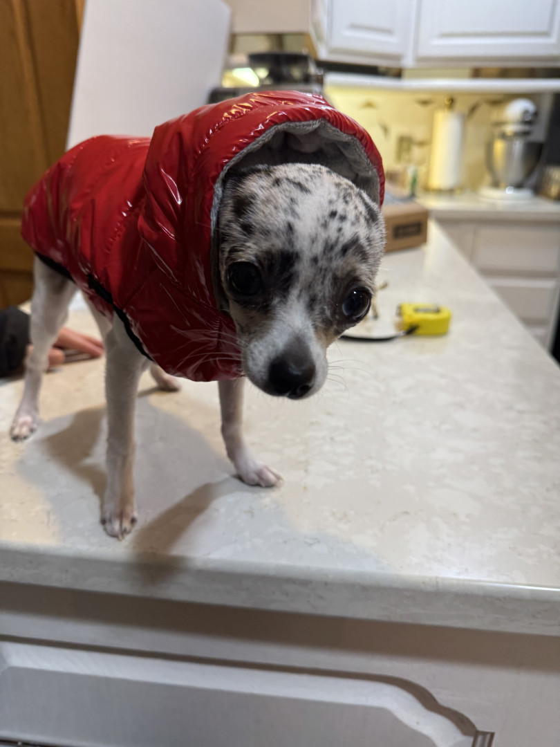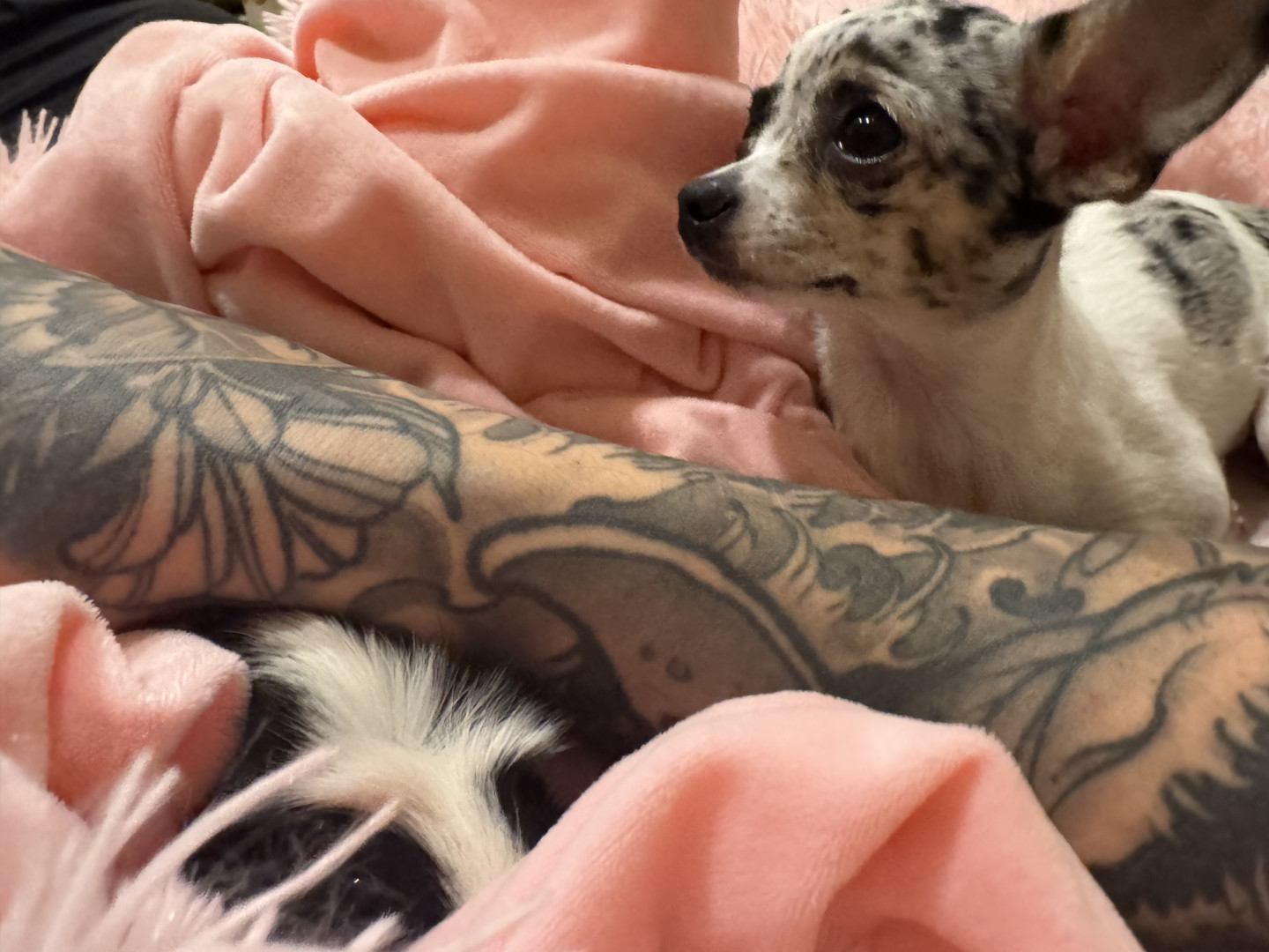 “Pepper Sprinkles the spicy merle Chihuahua—tiny, fearless, snuggly, protective. We call her Pepperoni because she’s spicy and pure sass!