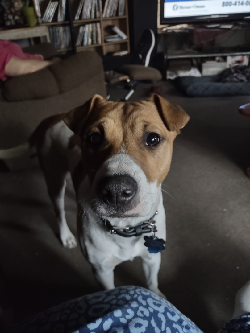 He loves to hop up on people's laps and lay down and he loves to play Tuggle war with his huge rubber bone and bouncy ball.