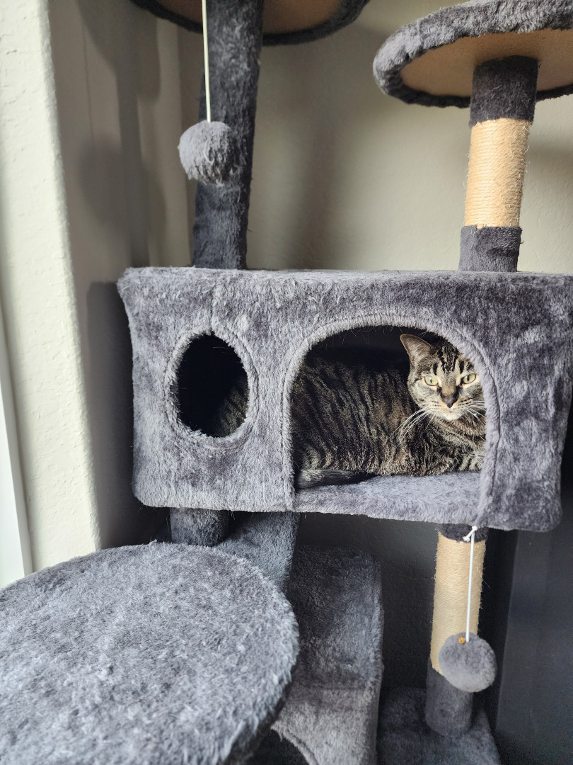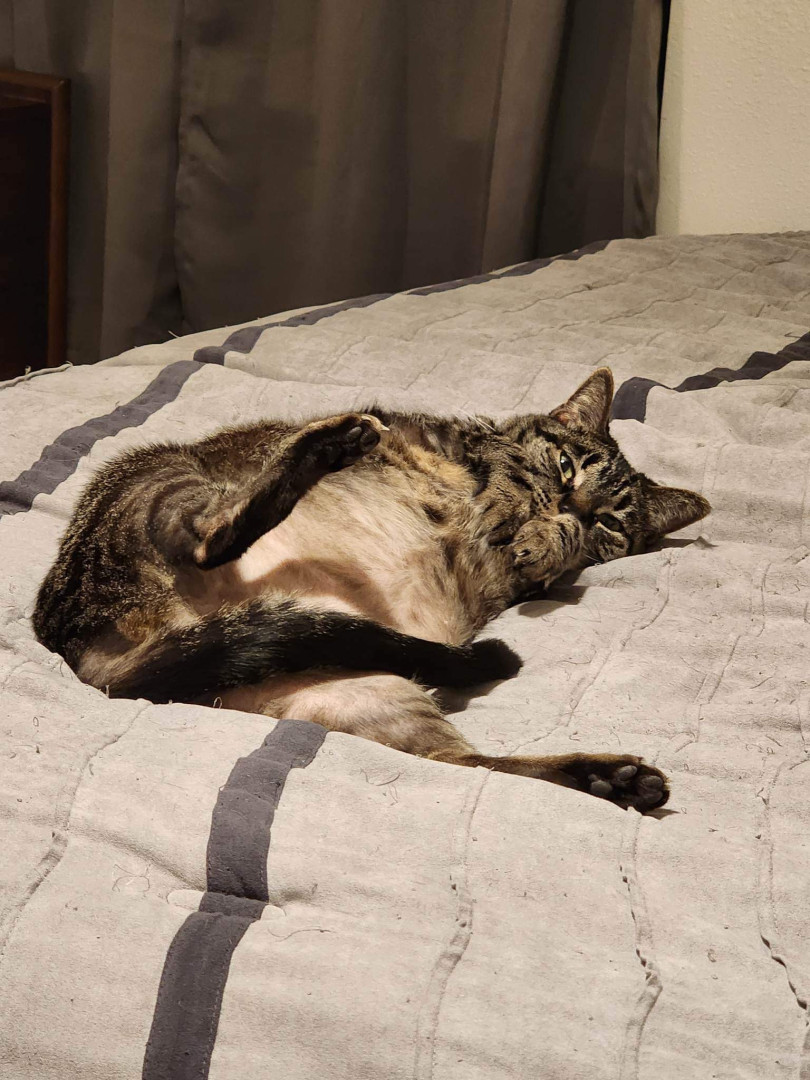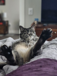 Being an 11 year old tabby, she acts so much like a teen. She's very playful and extremely vocal, you can have a full conversation with her any time of day! She's very curious and loves people!!