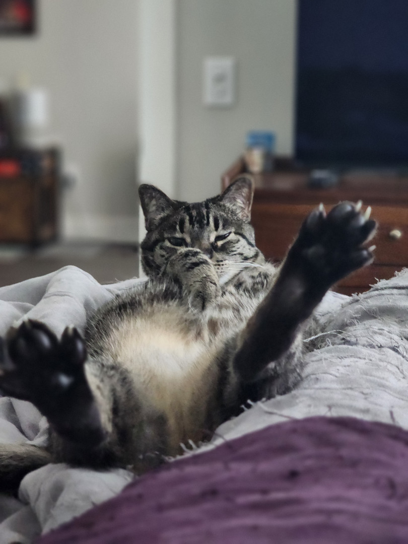 She can be quiet, but the moment her humans are on a phone call or she hears the phone ring, she will quickly run to us and start talking! She knows when you're taking photo ls of her, she will strike her usual pose - front paws curled, belly showing with legs out!