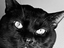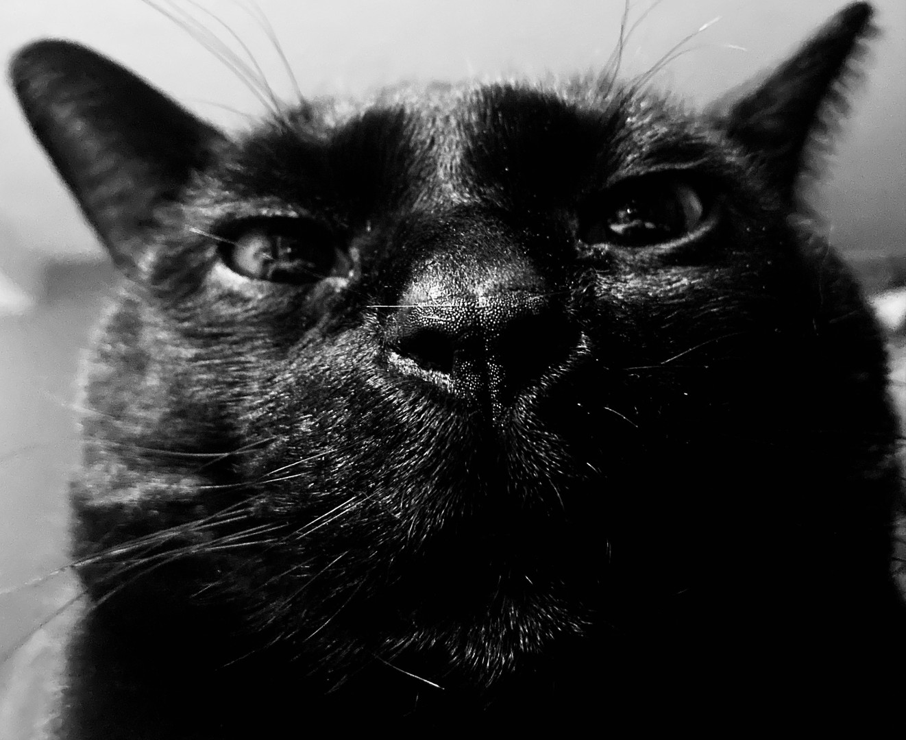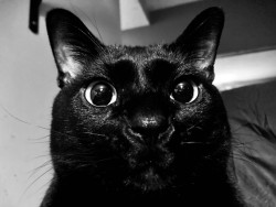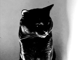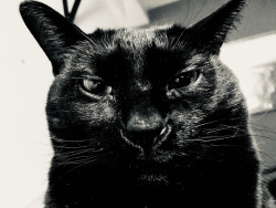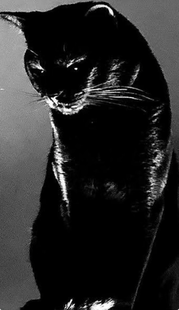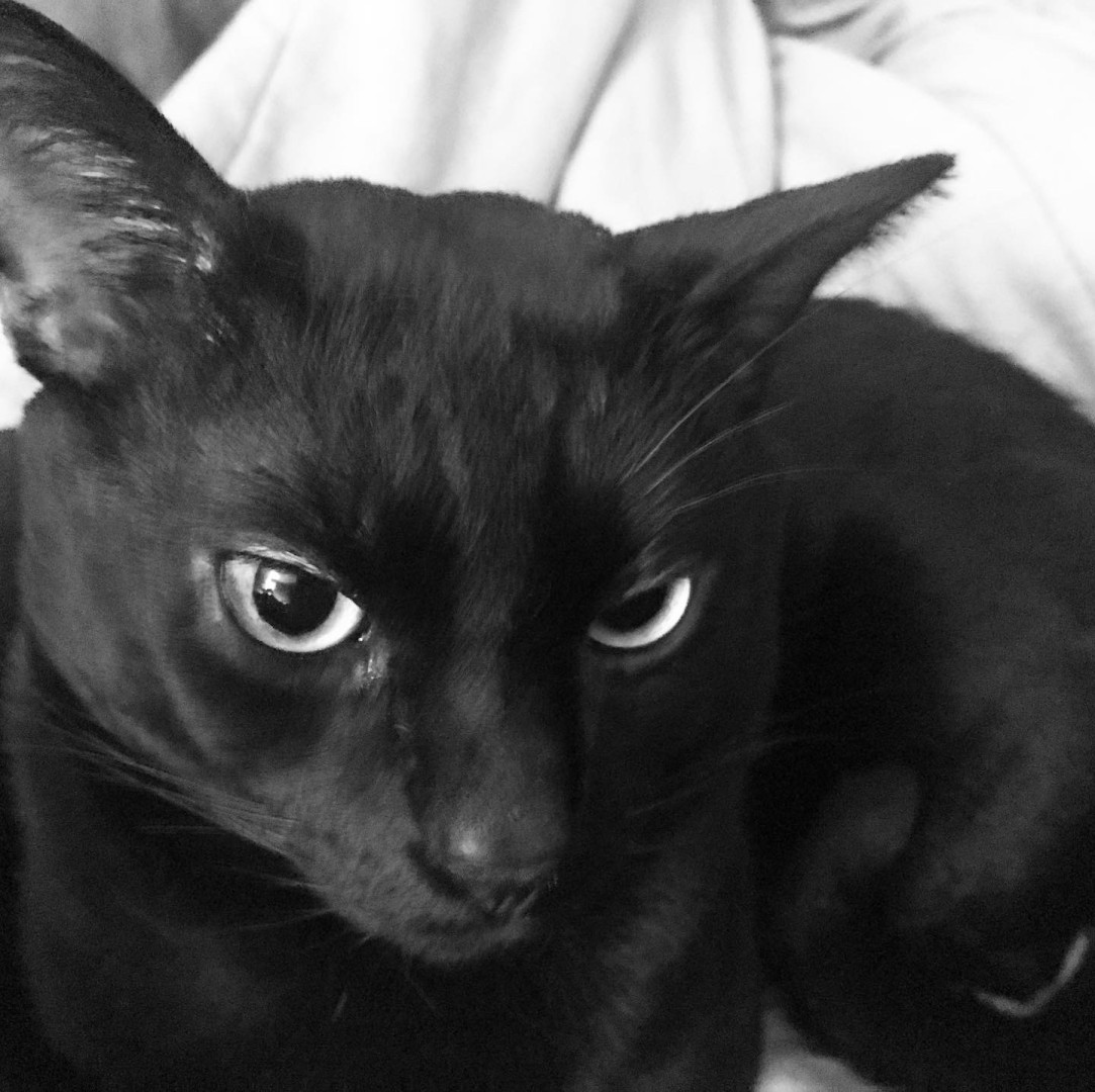 Rescued as a tiny feral kitten , pip grew up to be a big panther . Sleek and glossy black