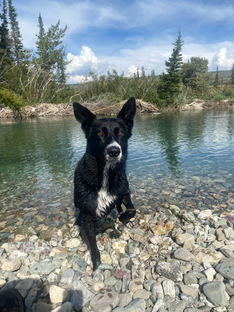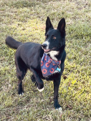 She is a border collie mixed with a Brazilian bear dog. She’s a cute little black dog with a little white fur and a cute little nose ๐