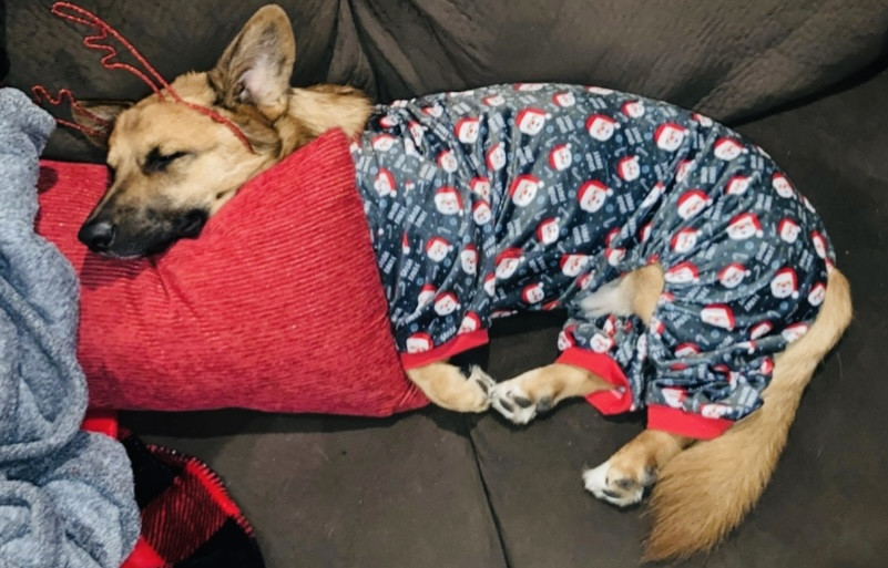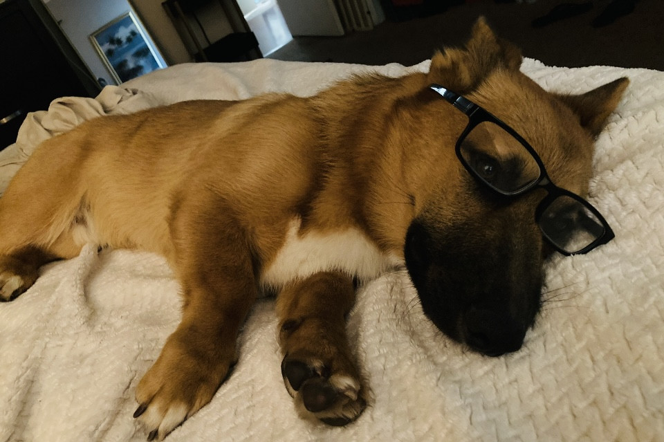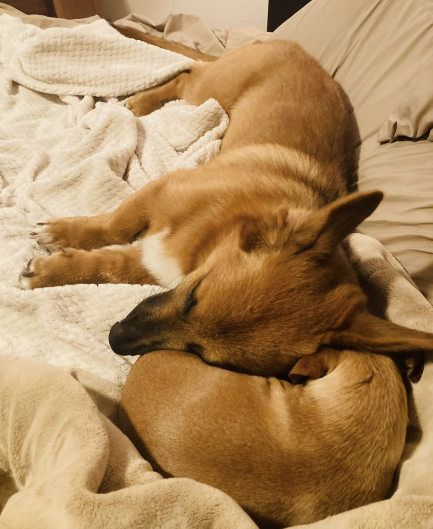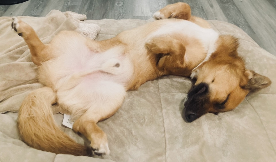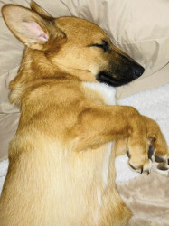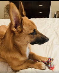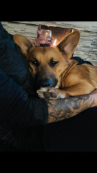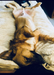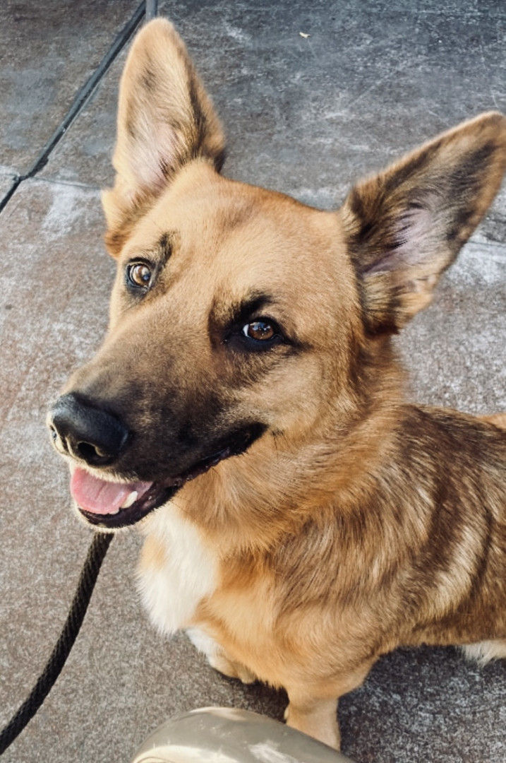 He is a silky soft cuddly German shepherd corgi mix. He was abused and rescued by me. He gives the best love hugs. Stay gold pony boy!