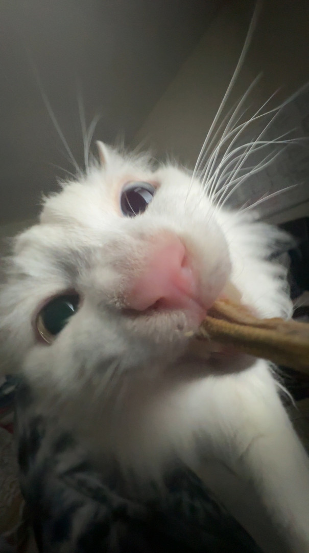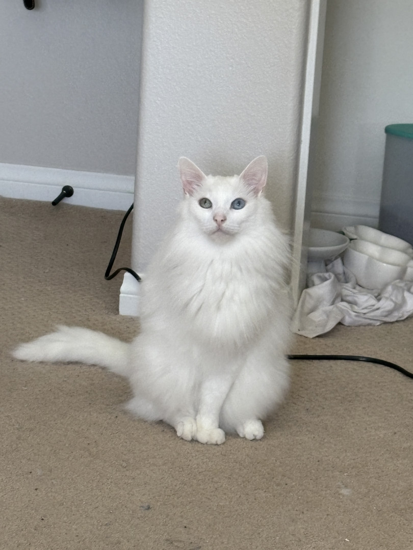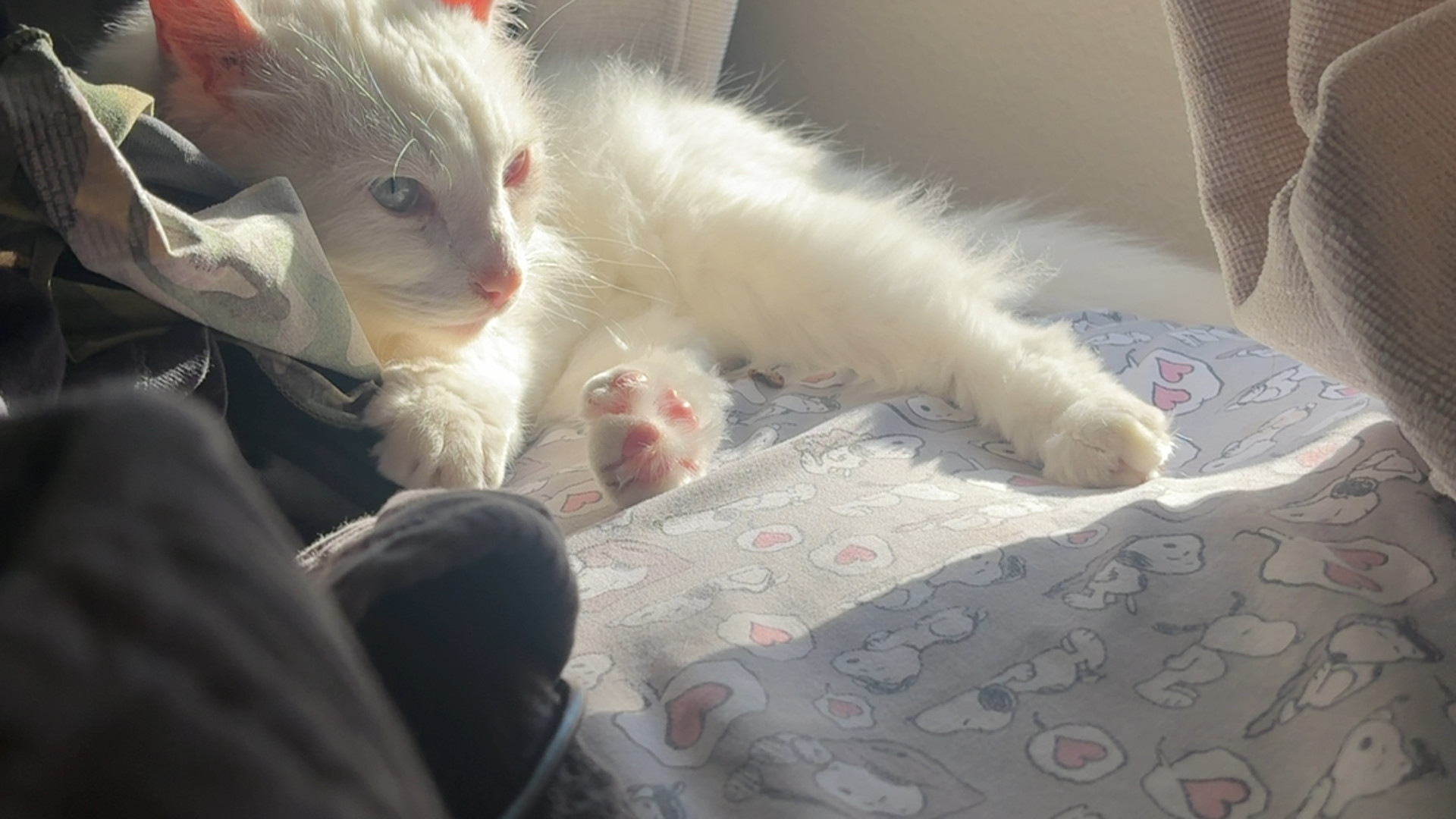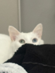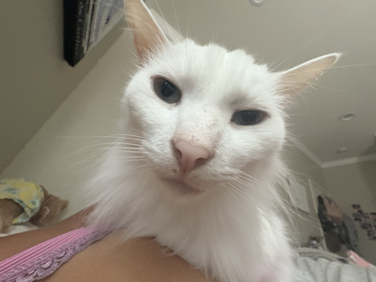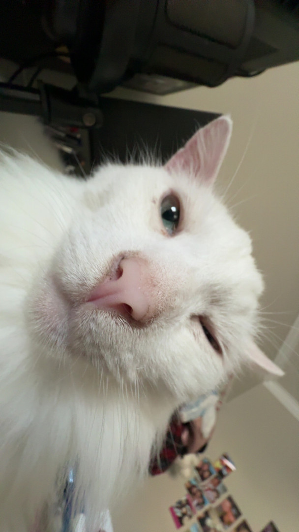 Cuddles, purrs, and playful goofiness. Popcorn is all heart. He’s a Turkish angora, with three legs, and heterochromia (green and blue eye).
