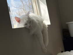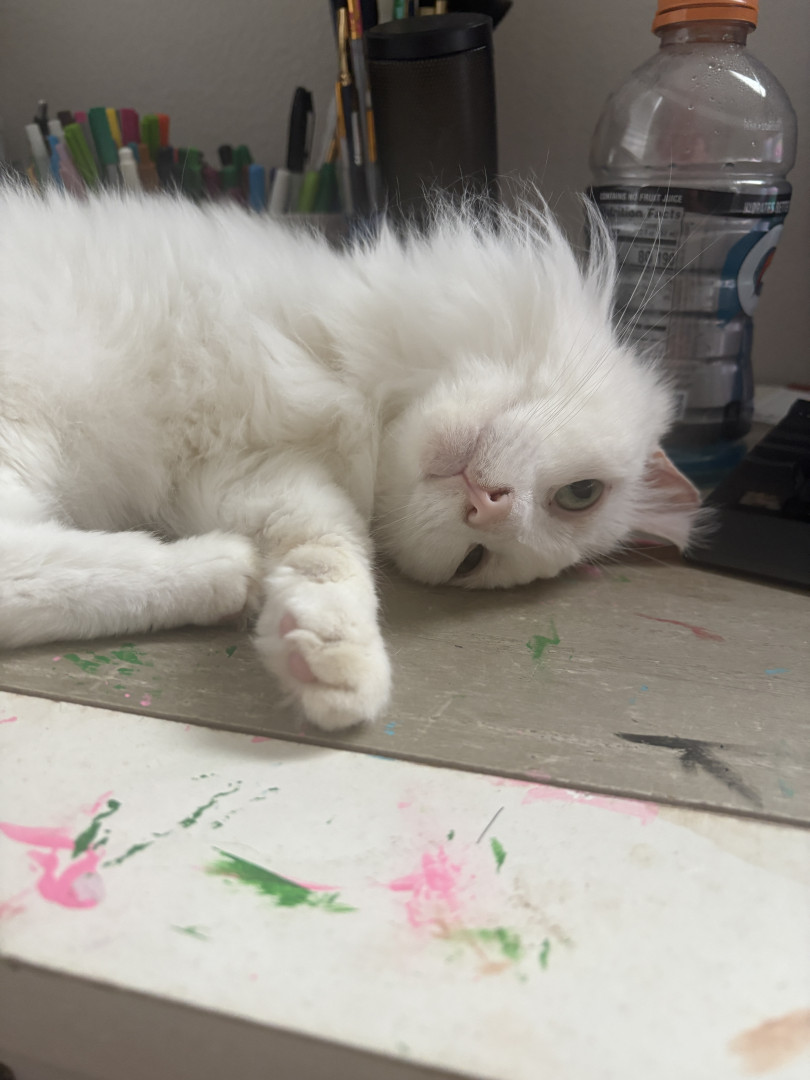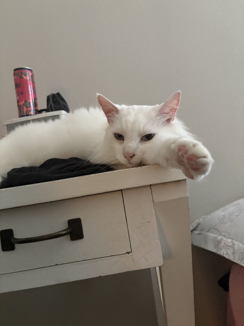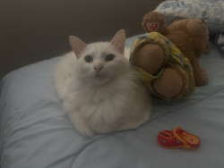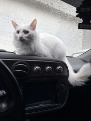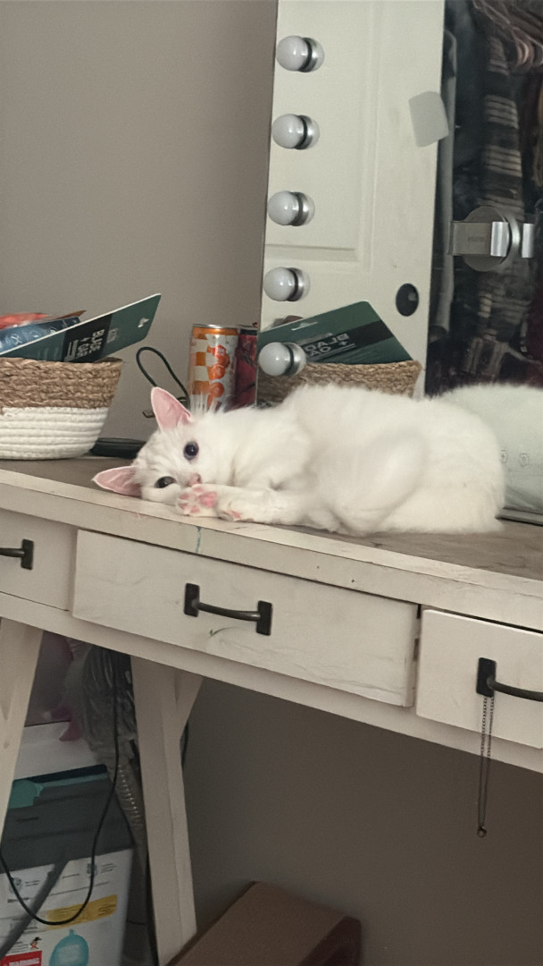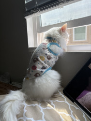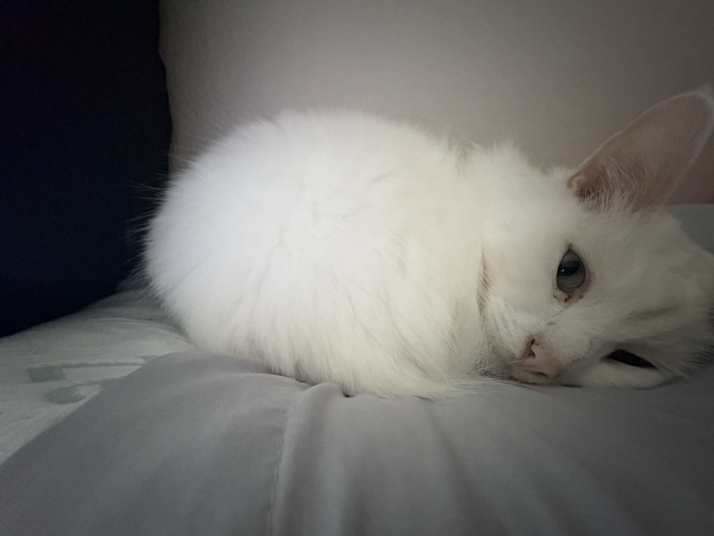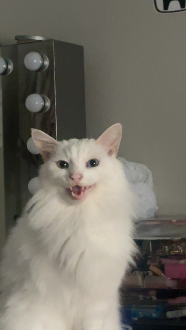 Cuddles, purrs, and playful goofiness. Popcorn is all heart. He’s a Turkish angora, with three legs, and heterochromia (green and blue eye).