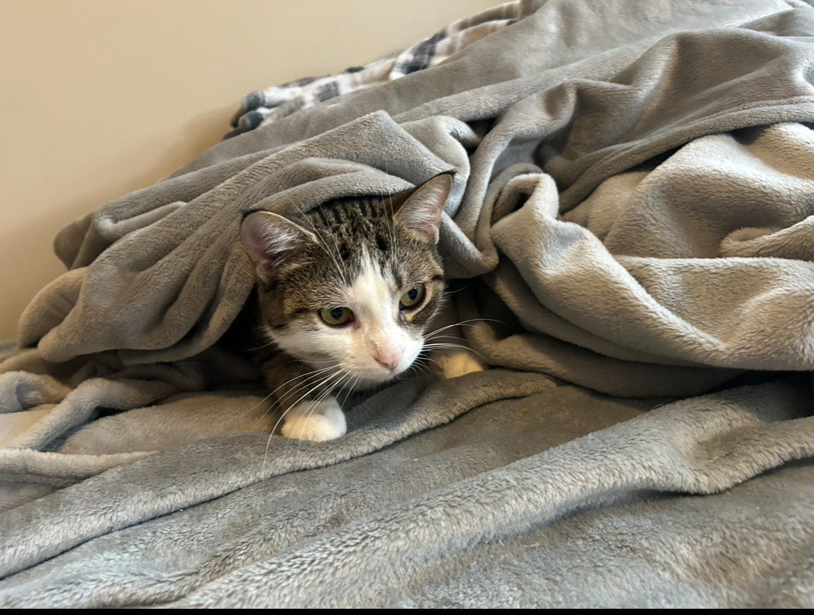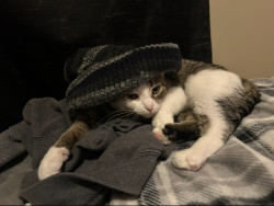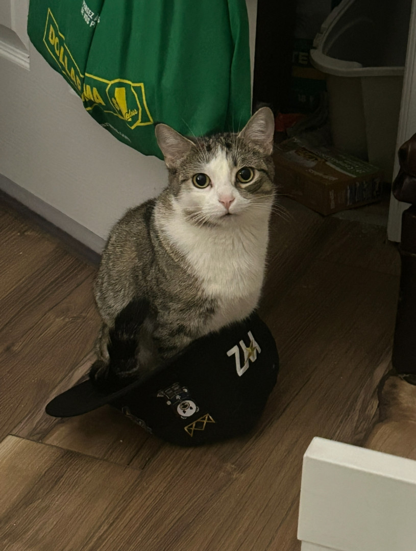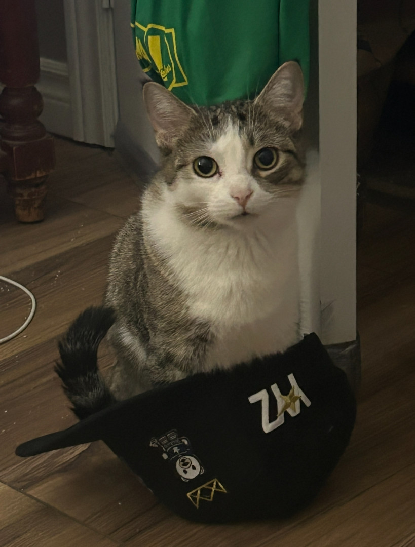 Very cuddly, friendly, accommodating. She’s a smaller cat, likes to climb door frames like spider man