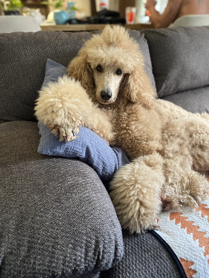 Standard female poodle, 5 1/2 yrs old, very loyal and she is the alpha of the pets at home. The expressions on her face are almost human lik