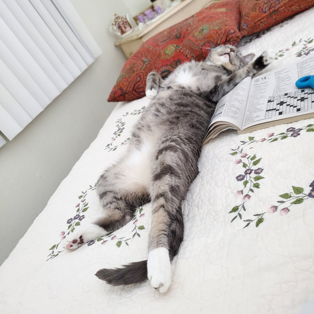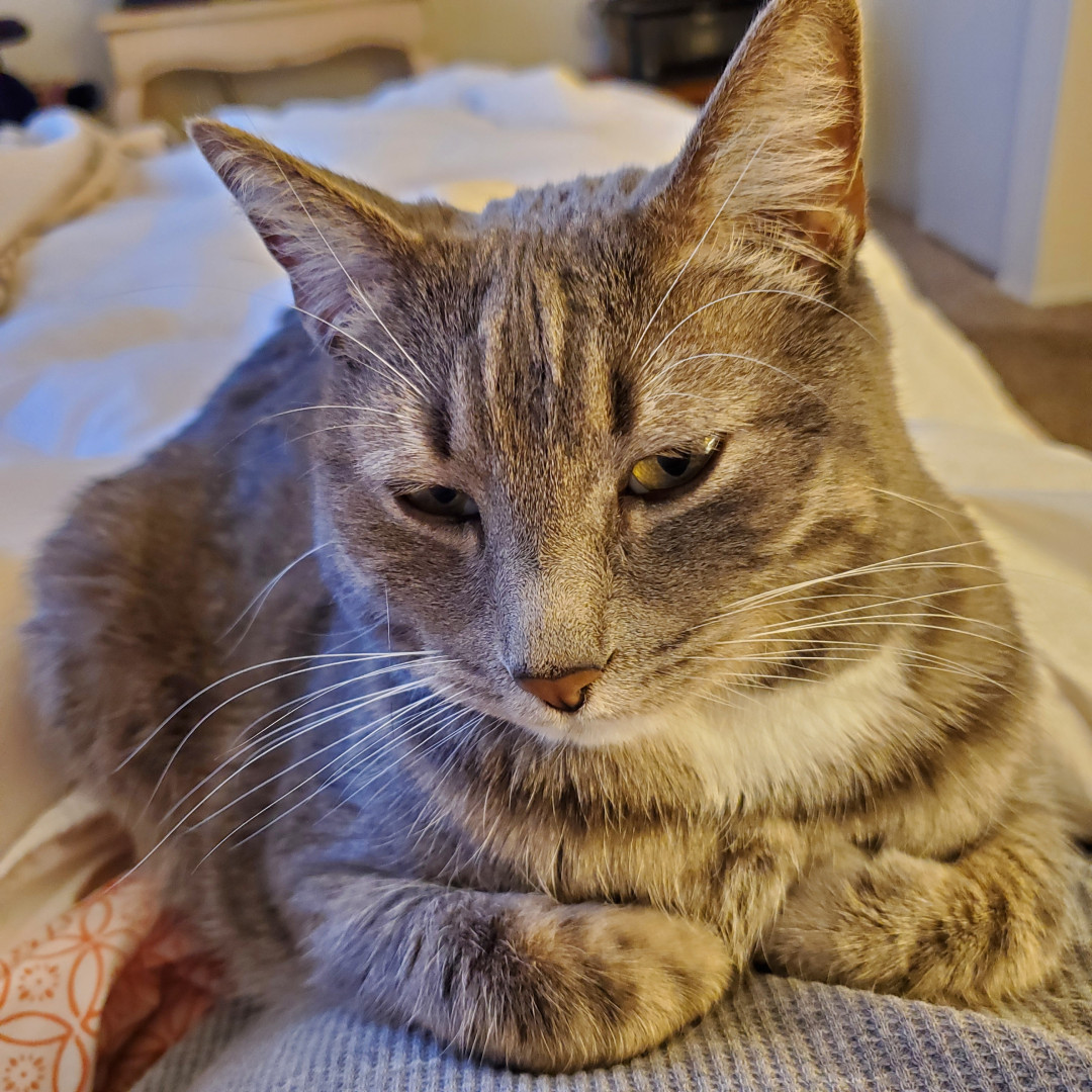 I think the way she has adapted to travel, becoming a contented indoor instead b of outdoor cat, and her sensitivity. Plus, her true love was our large pit bull, OG, who is no longer with us.