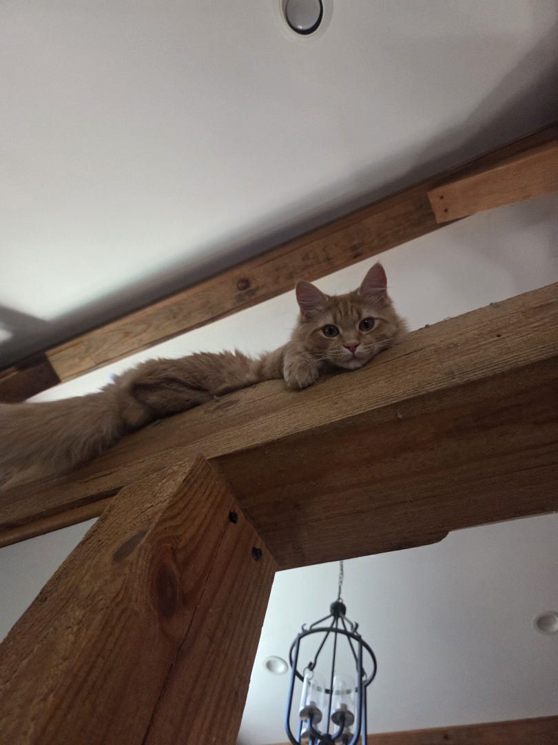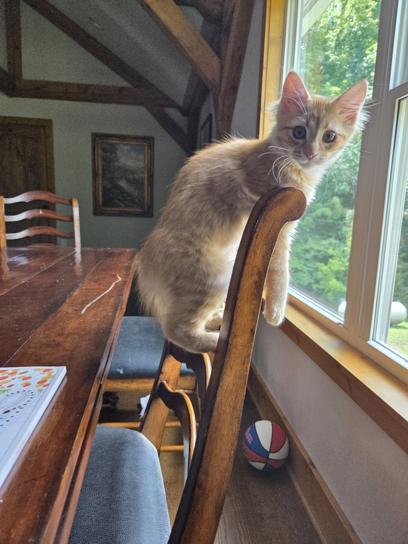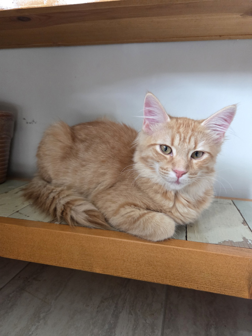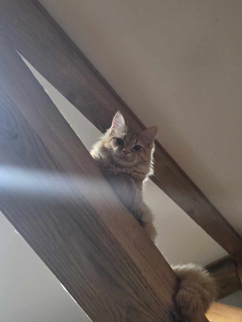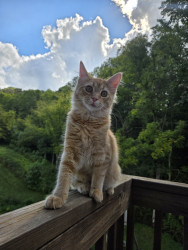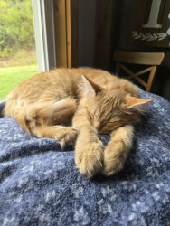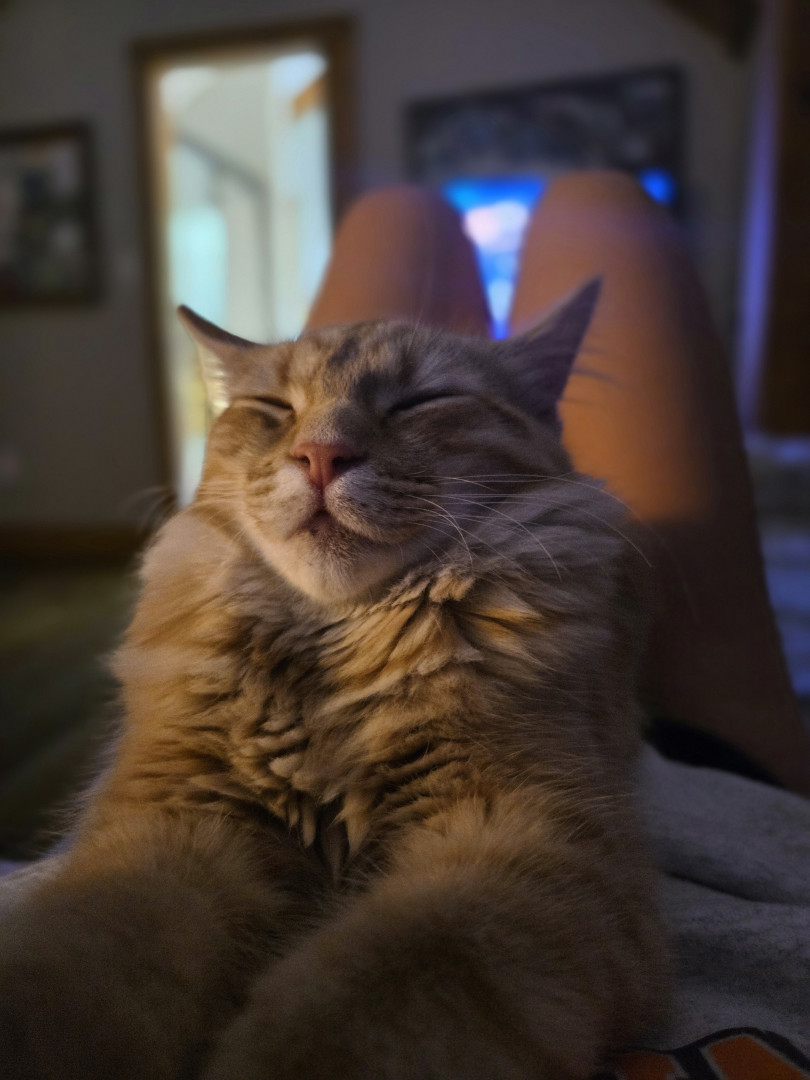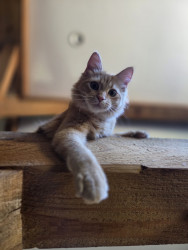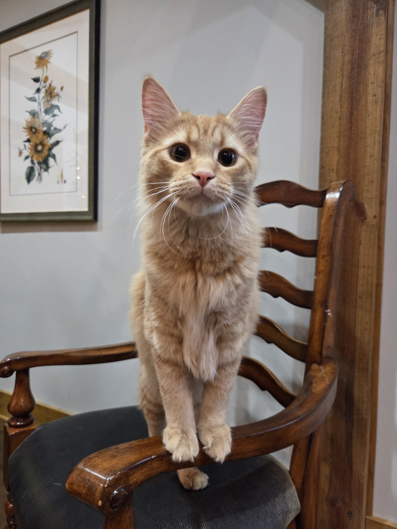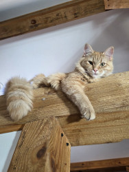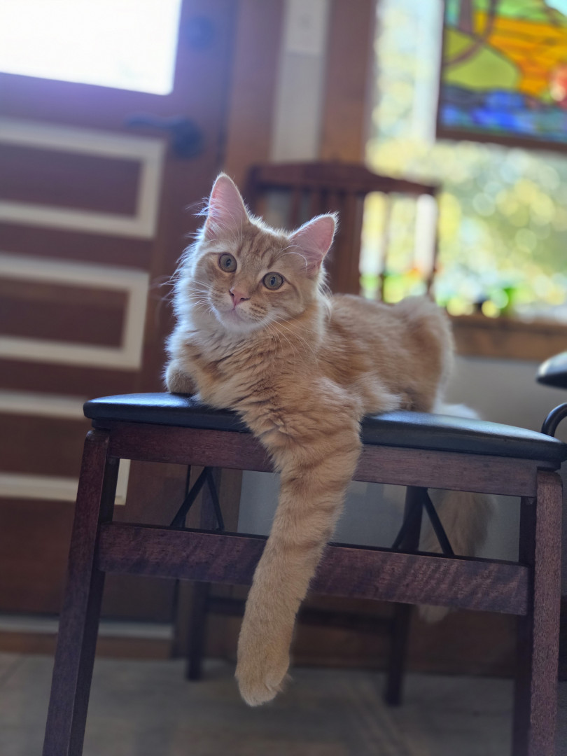 He is a sweet fluffy dude who always is down for a snuggle. A friend to all he meets! He makes the cutest sounds when he talks!